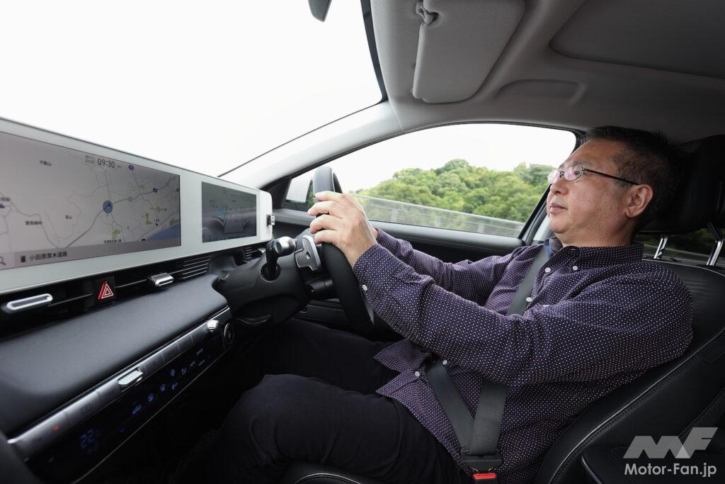 ワインディングではリヤの安定感がしっかりしていることで、EVパワーを活かして滑らかなコーナリングを楽しめる。ステアリングの操作量に対して動きがやや掴みづらいのはリヤに荷重が乗っていることや、旋回中にレーンキープアシストが強めに介入してくることが大きい。もう少しゆったりとした操舵フィールに合せた味つけが必要だろう。