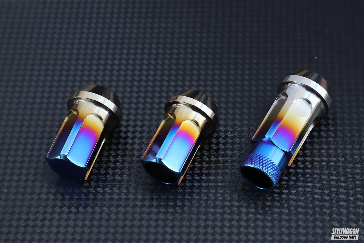 なんといっても目を惹くのが、その形状。オリジナリティを追求した独自のペンタゴン(5角形)デザインは、さりげなくも確実に、足元へ個性を与えてくれる。袋タイプと2種類の貫通タイプの全3モデルが用意され、素材には強度と軽量性に優れる64チタン合金を採用。チタンならではの焼き入れによる鮮やかな発色もポイントだ。また、一般的なスチールナットの1台分の重量が約840グラムのところ、ペンタゴンチタンレーシングナットは袋タイプで約445グラム、貫通タイプでは約371グラムと約420グラムと、驚くほどの軽量化を実現している点も見逃せない。4本セットも用意されているので、各ホイールに1本ずつ、ロックナットのように使うなんてのもありだ。