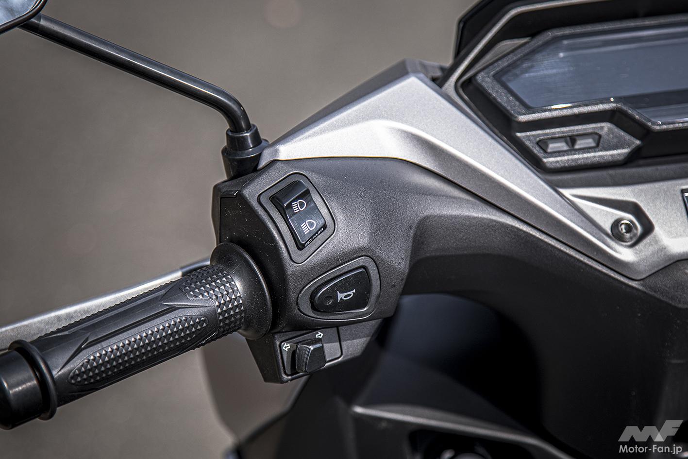 左右の手元のスイッチは至ってシンプル。左側の、下にウインカースイッチ、上にホーンボタンという近年のホンダの構成にはあまり賛同できないが、シンプルなのは歓迎したい。欲を言えばキルスイッチがあると自主的なアイドリングストップができたのに、とは思った。