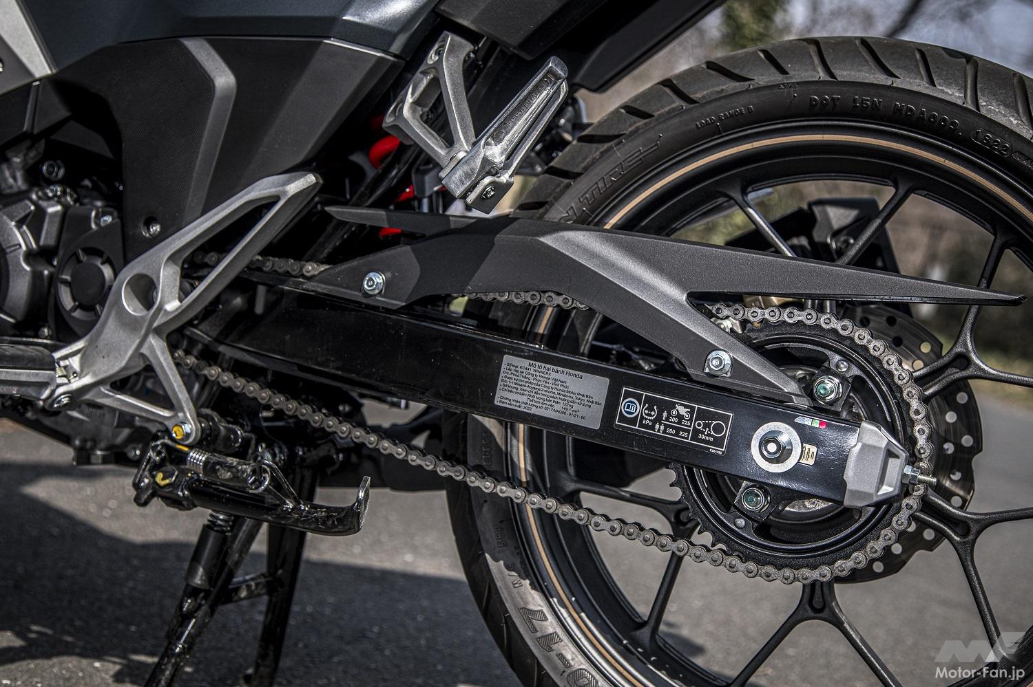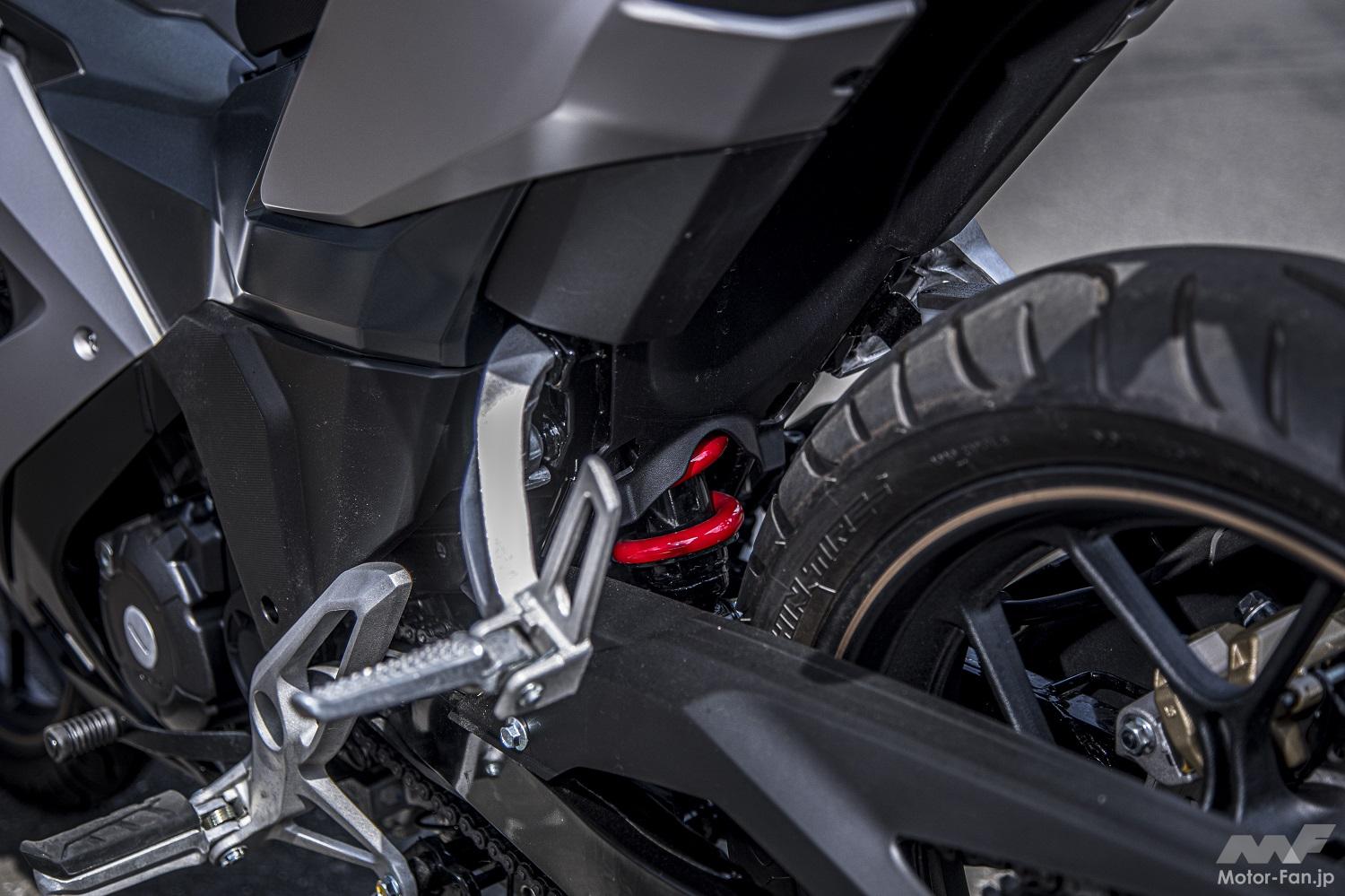 フロントフォークのしなやかな構成により、逆にリア周りはしっかりと作ってある印象。スイングアームもしっかりしているし、リアサスもクラスを越えた、ちゃんとスポーツバイク然としたものが装着されている。作動性も極めて良好だ。