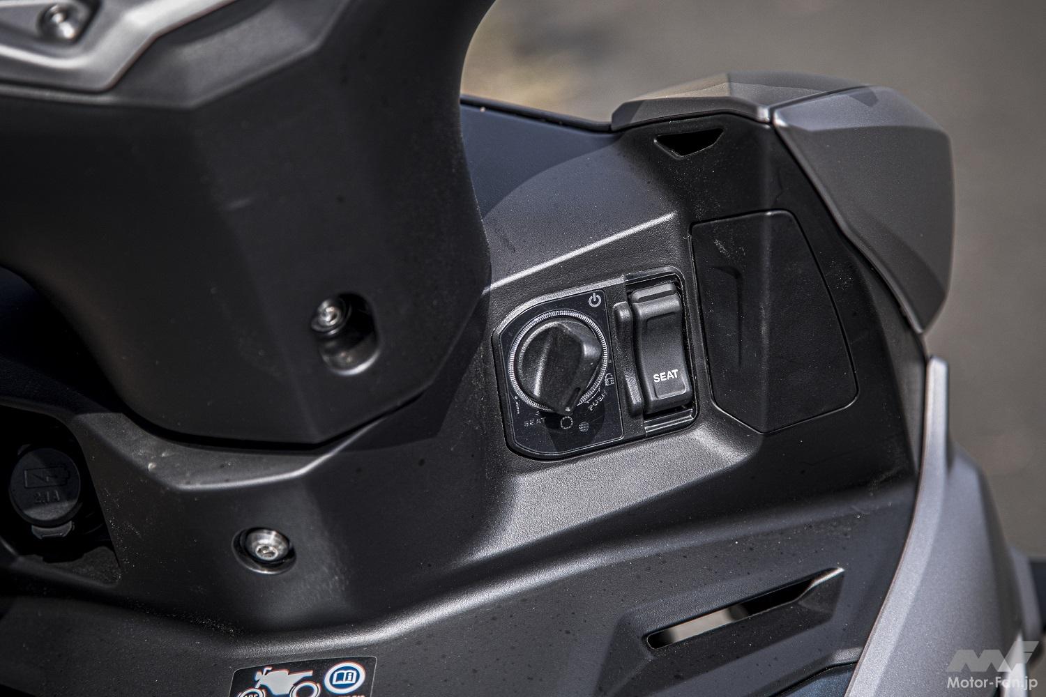 フロントカウル内側にはポケットやボックスの類はない。キーはスマートキーを採用しているが、これは好みの問題だろう。筆者としてはバイクにおけるスマートキーは不要と考えているクチで、ここはメカニカルキーで何も問題はないと感じる。左側にはUSBアウトレットを用意するがボックスがないため、スマホなどと接続するなら後付けのホルダーなどを用意する必要があるだろう。