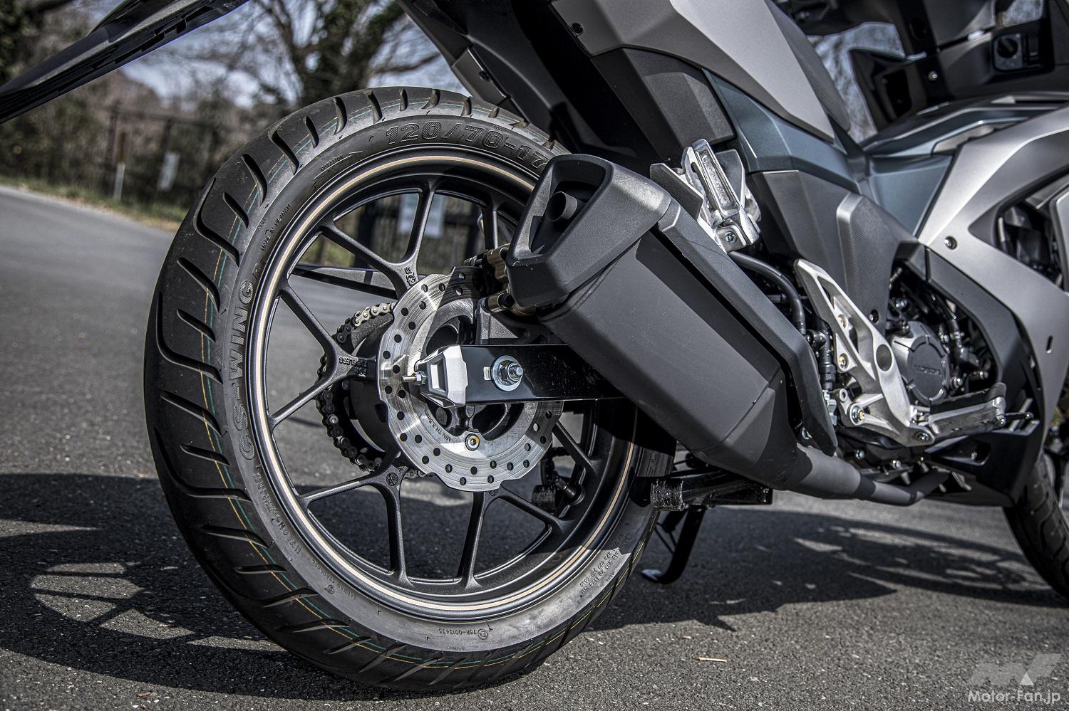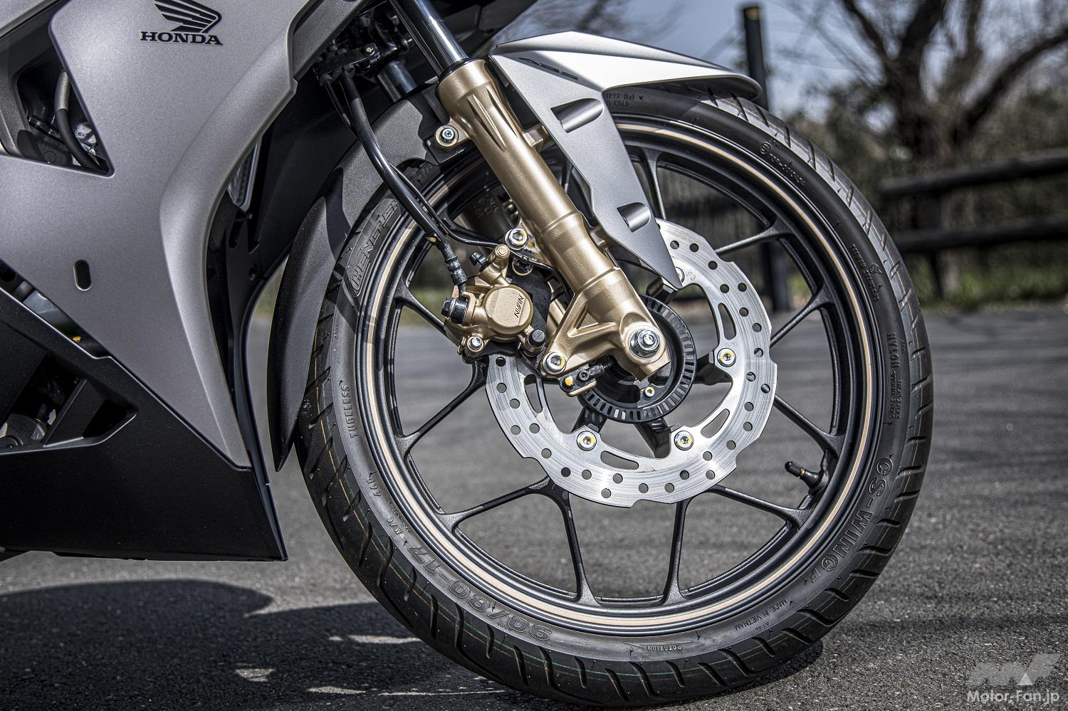 フロントブレーキはピンスライド式の1ポッドキャリパーで、スポーツバイクとしては心許ないかと思いそうだが、フォークがアンダーブラケットのみで支えられていることを思うとこれが良きバランスにも思えた。タイヤは90/80-17と細く、これが またスパスパと思い通りの切れ味を生んでいると感じる。タイヤブランドはチェンシンのCS-WINGというモデルだった。ABSも装備。