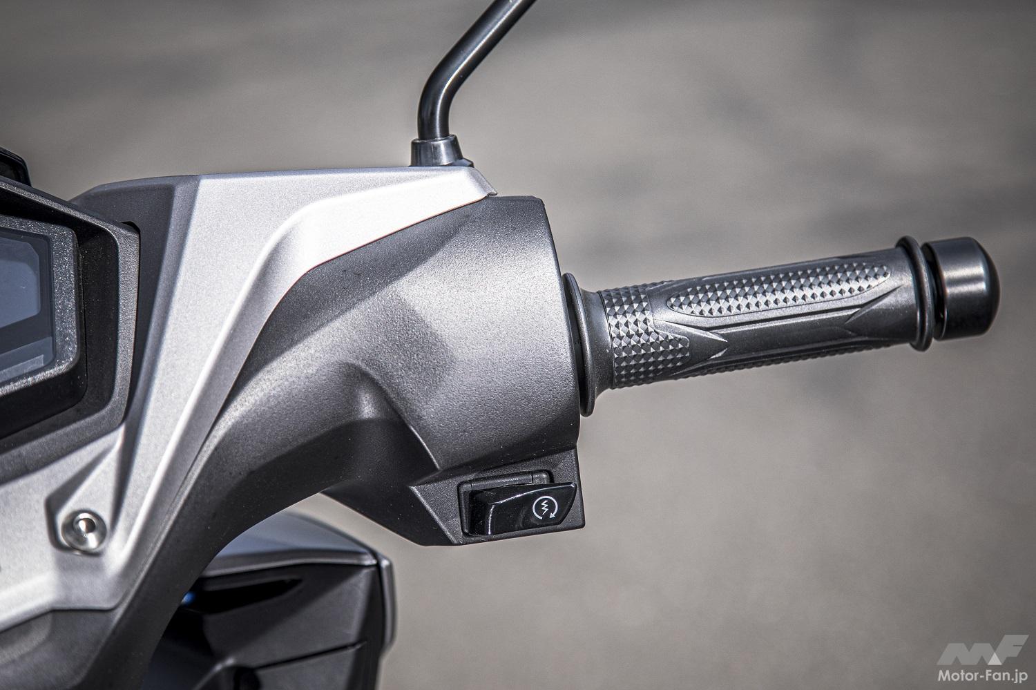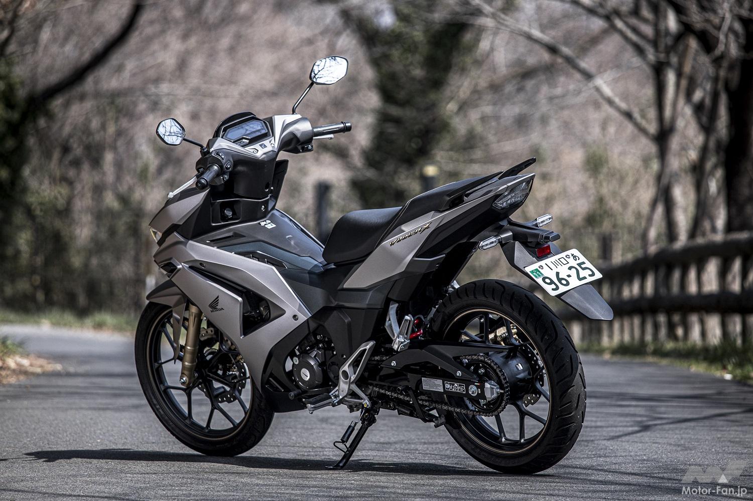 150cc水冷DOHCエンジンそのものは16.2馬力と、PCX160などと大差ない数値ながら、アクセルレスポンスの鋭さやこの軽量車体とのマッチングなどにより非常に速く感じる。低回転域ではパルス感のあるトルクフルな特性、6000rpm以上はDOHCらしい弾けるパワーバンド。どこをとっても楽しい。なお撮影日の走行では遠慮なく高回転域も多用したにもかかわらず、メーター上の燃費計では42km/Lを示していた。