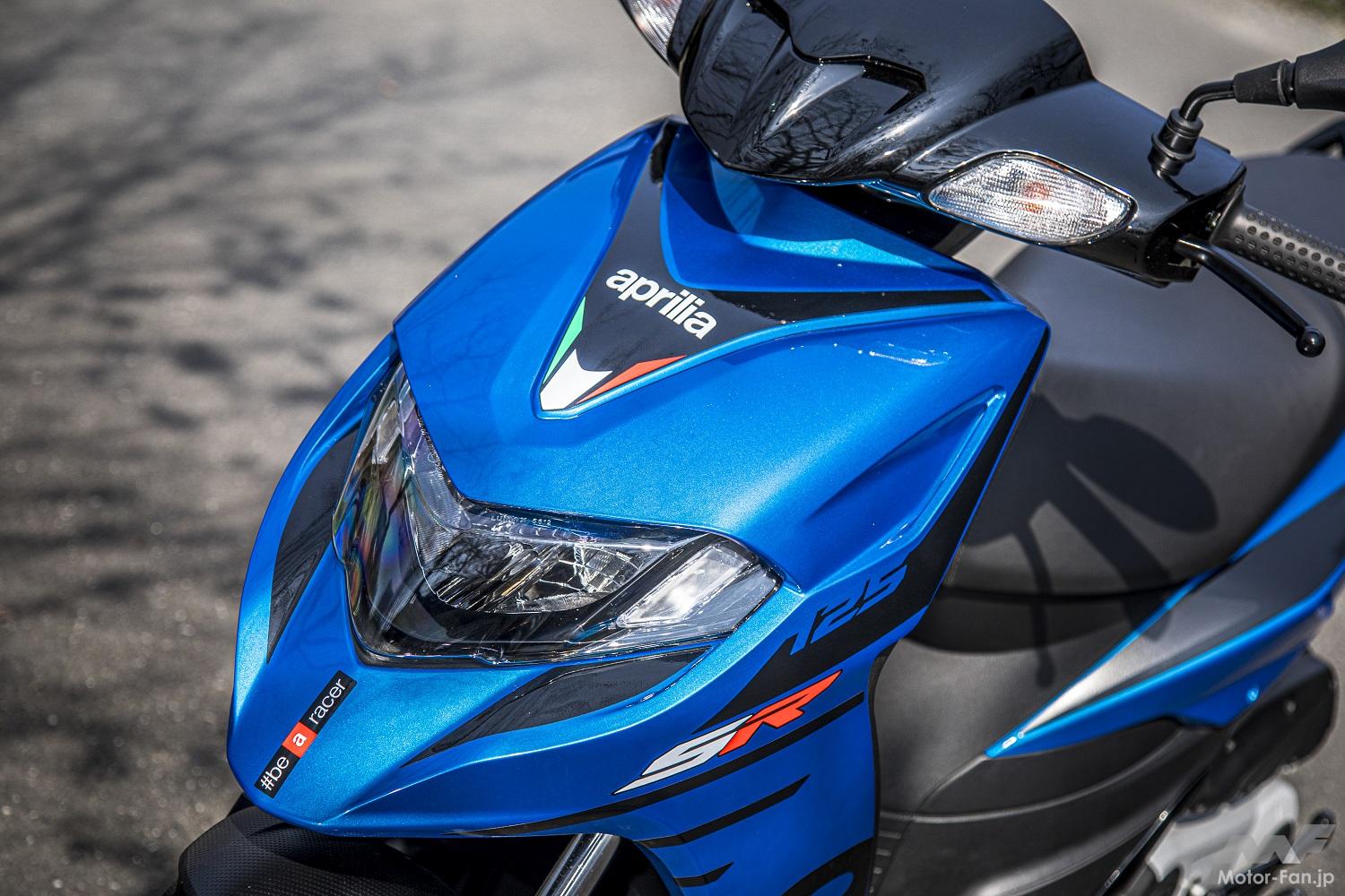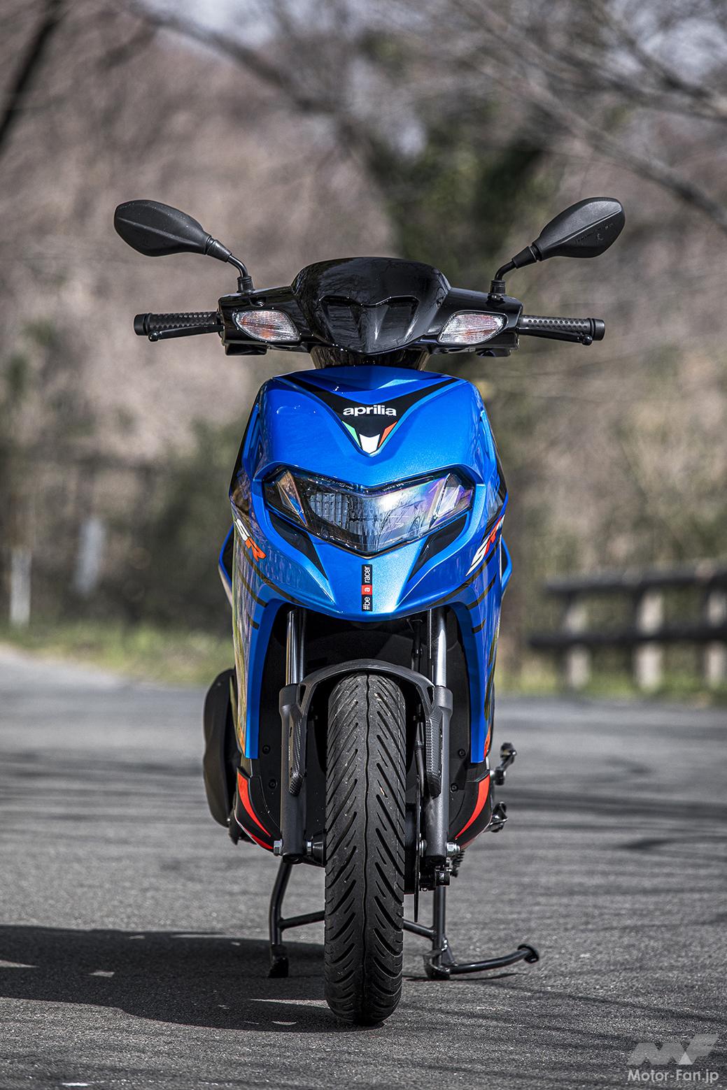 また乗車姿勢は足を前方に投げ出せないためかしこまった乗り方になりがちな14インチ車ではあるが、フロントカウルにつま先の逃げ部分があり意外と快適だった。またステップボードから少しだけつま先を外に出すとさらにリラックスできることにも気付けた。タンデムステップを出すのが少々難しかったのも気づいたところ。なお、せっかくイタリアンブランドのアプリリアに乗っているのだ。アレイシ・エスパルガロやマーベリック・ビニャーレスになった気分で、こんなパーカーを着て乗るというのも楽しさに思う。
