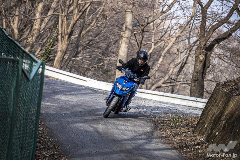 エンジンが優しいから、では車体の方ものんびりしているかと言えば、ステップスルー故の付き合いやすさはあるものの、こちらにはbe a racer感が残されていた。海外スクーターによくある、ちょっと腰高なポジションの時点で重心位置が高くスポーティな気持ちになる。前後同じサイズのタイヤを履いているのだが、そのおかげかフロント周りはドッシリとした安定感があり、その安定感ゆえに積極的に切り返したり寝かし込んだりといった操作がしやすかった。フロント周りに加えタイヤも剛性そのものは高めのイメージ、そしてブロック形状ゆえ、そのブロックがたわんであらゆる路面状況でもしっかり掴んでくれる。スポーティさの中にも安心感のある感触だったのだ。