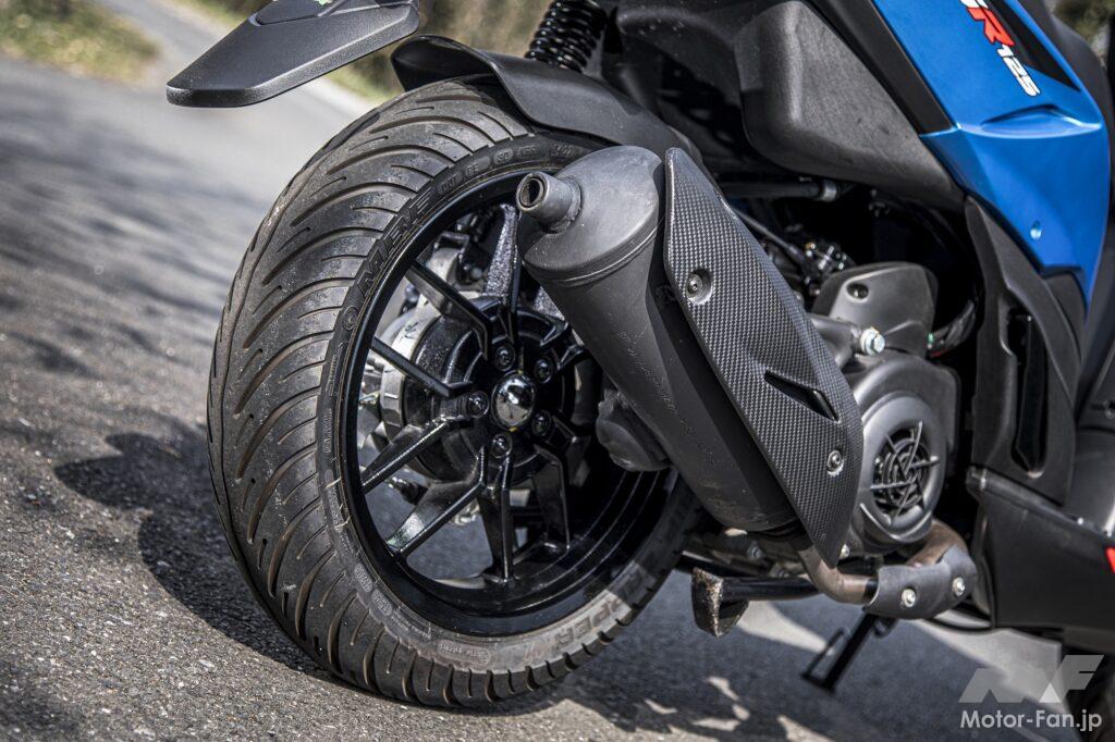 消音性が高いおかげか、それともそもそも低回転域で繋がる変速の設定のおかげか、排気音は静かで住宅街でも気にならない、リアタイヤはフロントと同じ120/70-14というサイズ。リアはドラムブレーキだがこれが良く効き、かつ前後連動の配分も絶妙で、止まれる安心感は絶大だ。