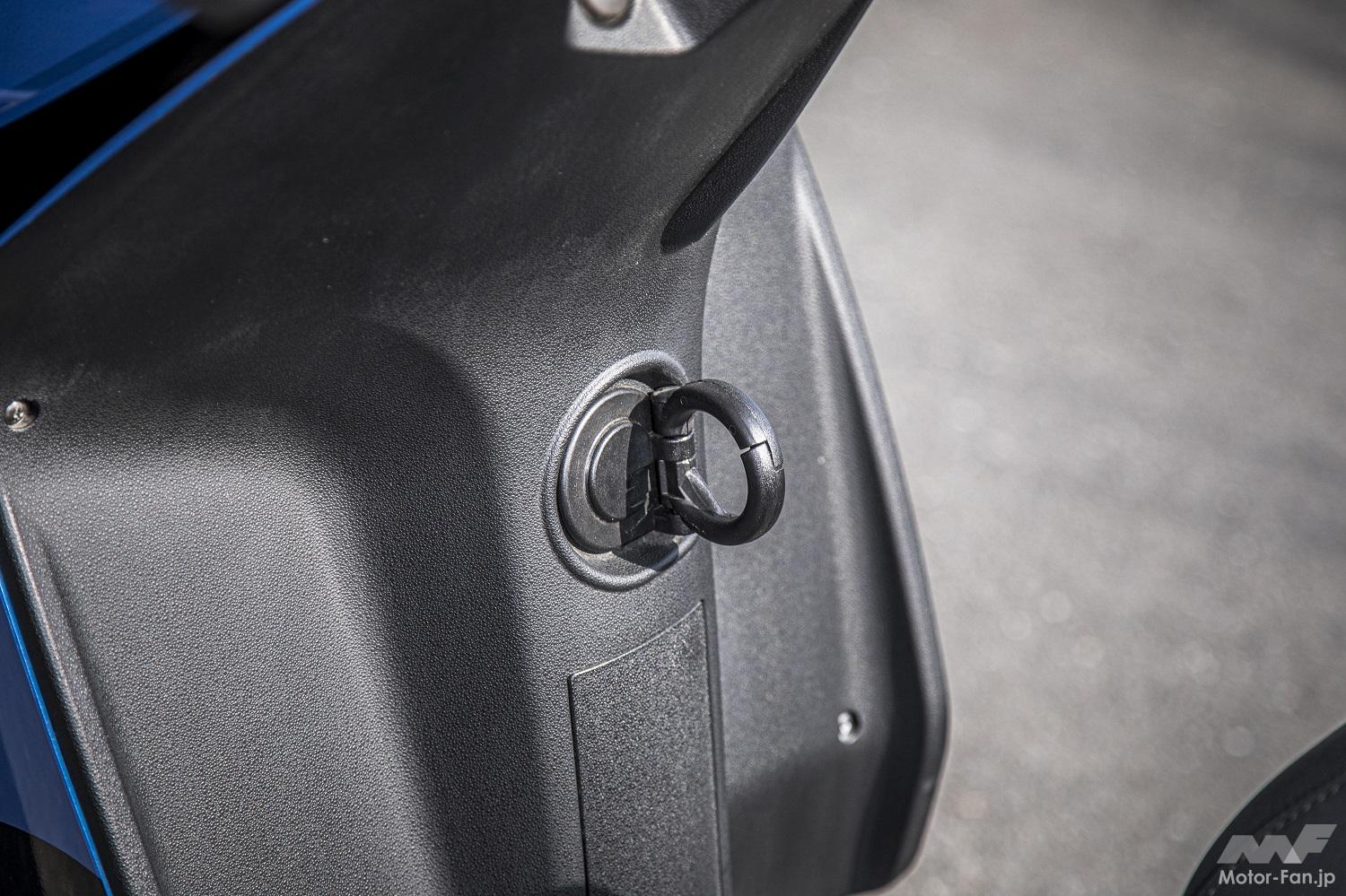 フロントポケットがないぶん膝の周りはスペースが広く、長身ライダーはもちろん、スポーティな気もちでシートの前の方に座る際にも窮屈にならない。ステップスルーのためコンビニ袋などぶら下げやすく、そんなニーズに対応するコンビニフックを装備する。