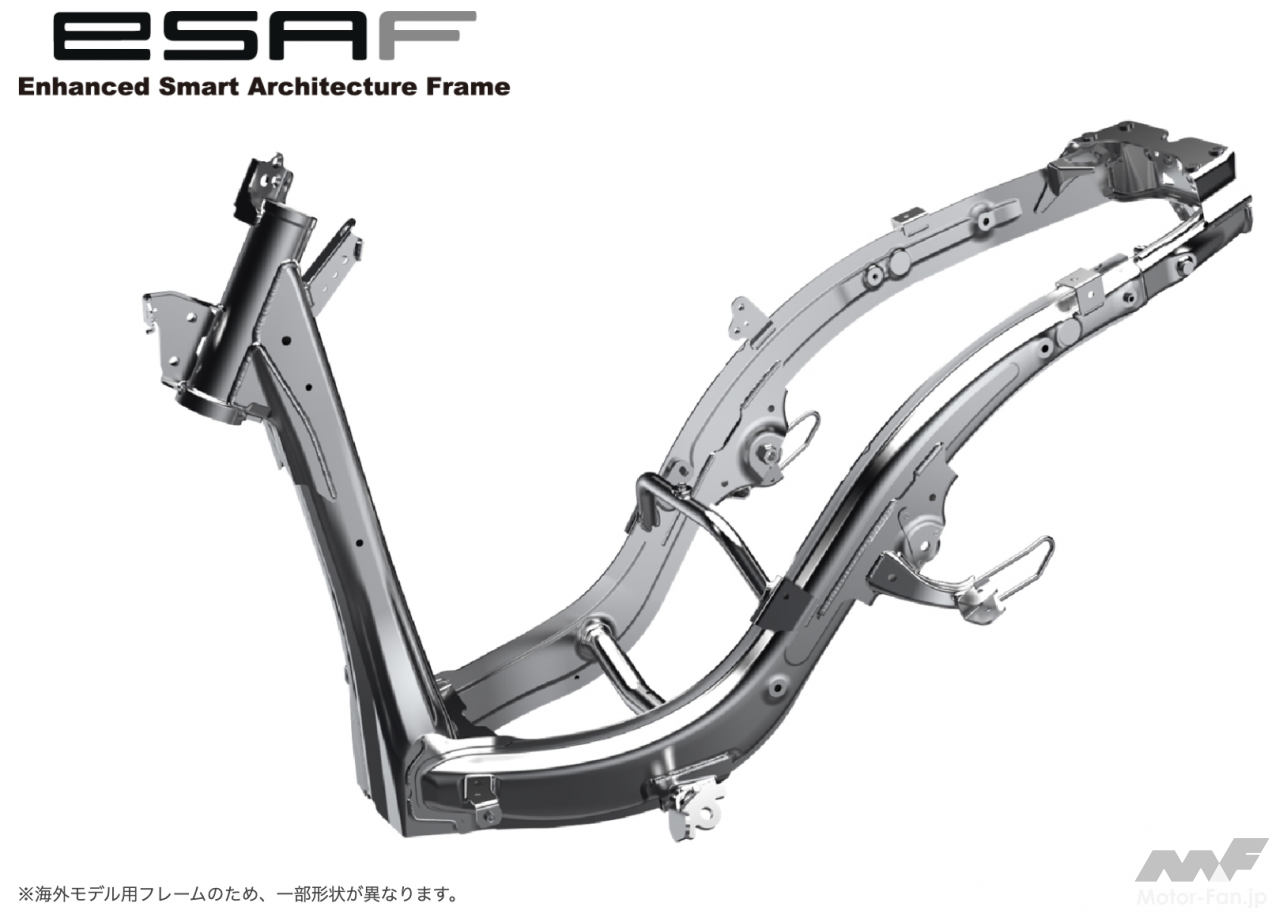 フレームも新設計されたeSAF(Enhanced Smart Architecture Frame)を採用。プレス成形された部材をレーザー溶接する方法で作られ、軽量化に貢献。縦方向のたわみに対する剛性も最適化(強化)されている。トータルで車重は従来モデルより4kg軽い96kgに仕上げられた。