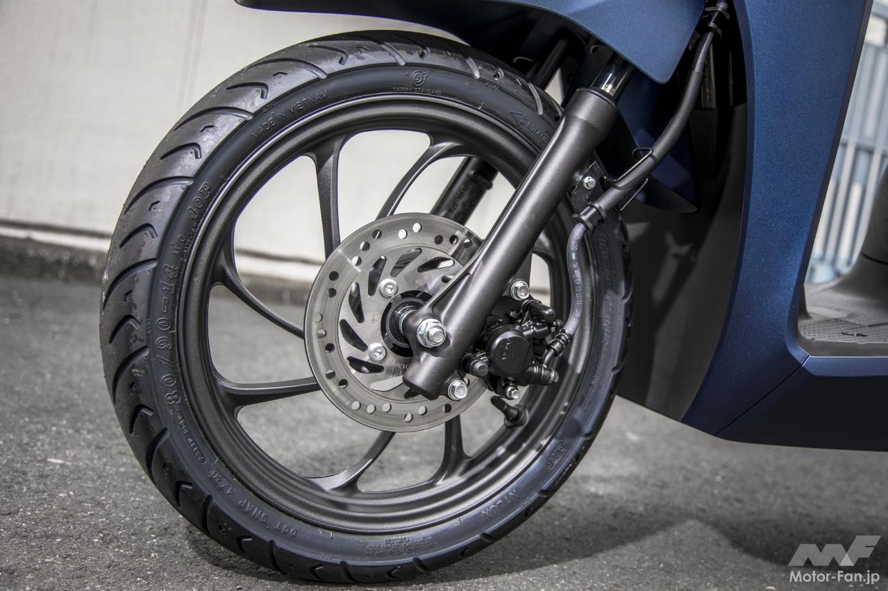 試乗車を目前にすると、フロントマスクを始め、ステップスルーのフラットフロア・デザイン。前後14インチホイールの採用や基本的な車体寸法に大きな変化は感じられない。