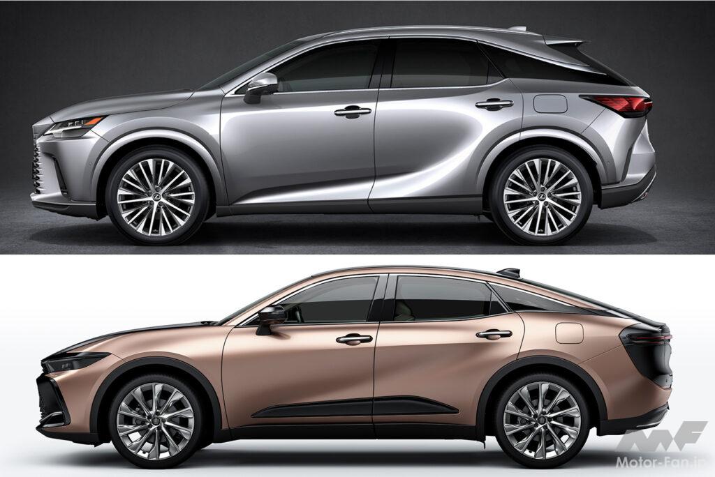 今度は、ホイールベース2850mm同士のGA-Kモデル、新型レクサスRXと並べて見てみよう。どちらも大径タイヤ(クラウン クロスオーバーが225/45R21=タイヤ径736.4mm、レクサスRXが235/50R21=タイヤ径768.4mm)を履いている。