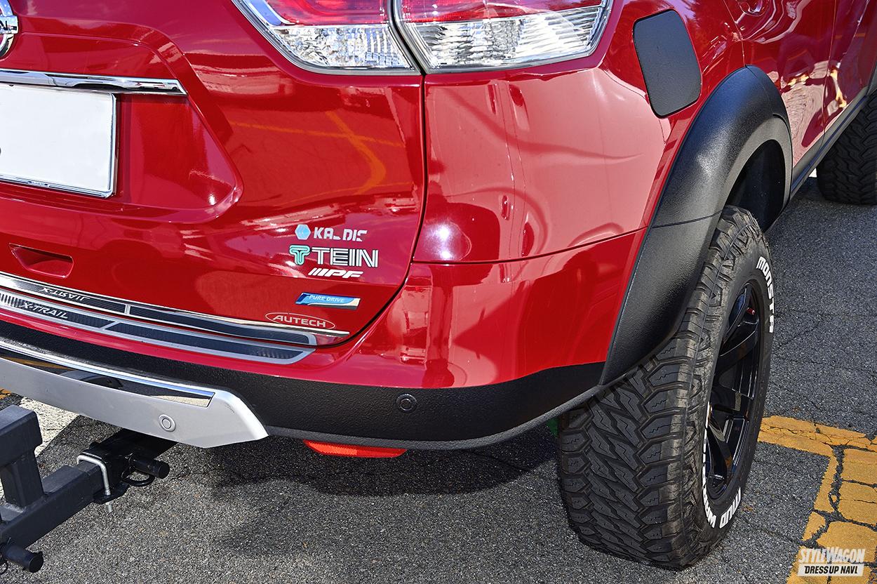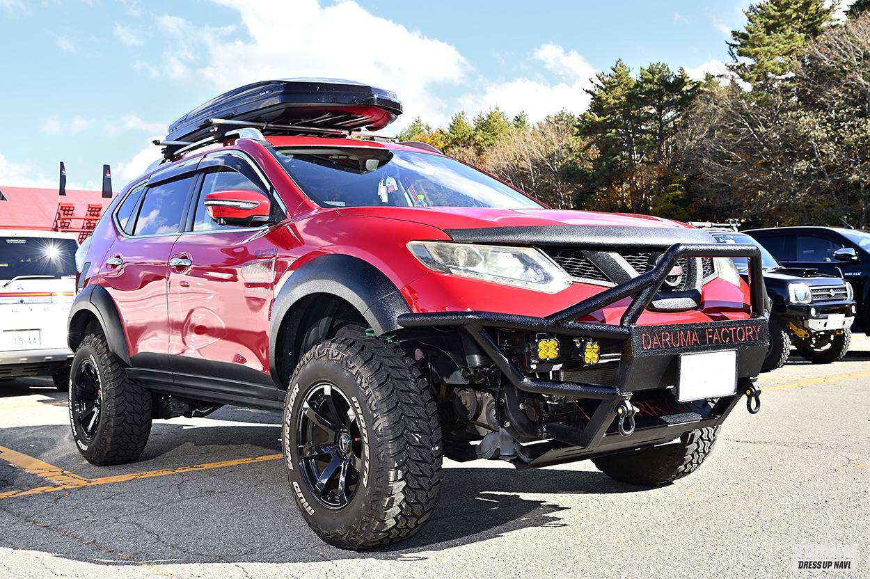 8年前、二十歳の時に購入したT32型のエクストレイル。「スノボをやっていて、当時の愛車プリメーラで動けなくなったことがあって、その時エクストレイルが抜いて行った」と4WDのエクストレイルを手に入れた。現在の姿への布石は1年半前。「ちょっと車高を上げようかな?」とテインの車高調を入れたのがきっかけ。半年で物足りなくなり、いつの間にか4インチボディリフト、1.5インチアップスプリング、タイヤなどで7インチ車高を上げてしまった。「アイアンバンパーは自作。先輩が溶接機を持っていて、海外の製品を見て、理想の形状にしました」。