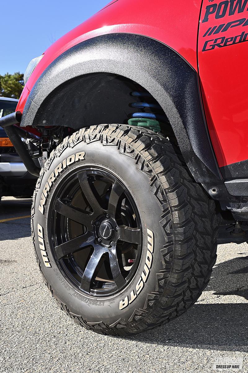 SPEC●ホイール:オリジン・DRF(17×9.5J+15)●タイヤ:モンスタタイヤ・マッドウォーリア(265/70-17)●エクステリア:アイアンバンパー=ワンオフ、フェンダー=ロードハウス、ルーフキャリア=スーリー、ヒッチメンバー=カート●サスペンション:ボディリフト4インチブロック、アップスプリング=カディス、サスキット=テイン 他