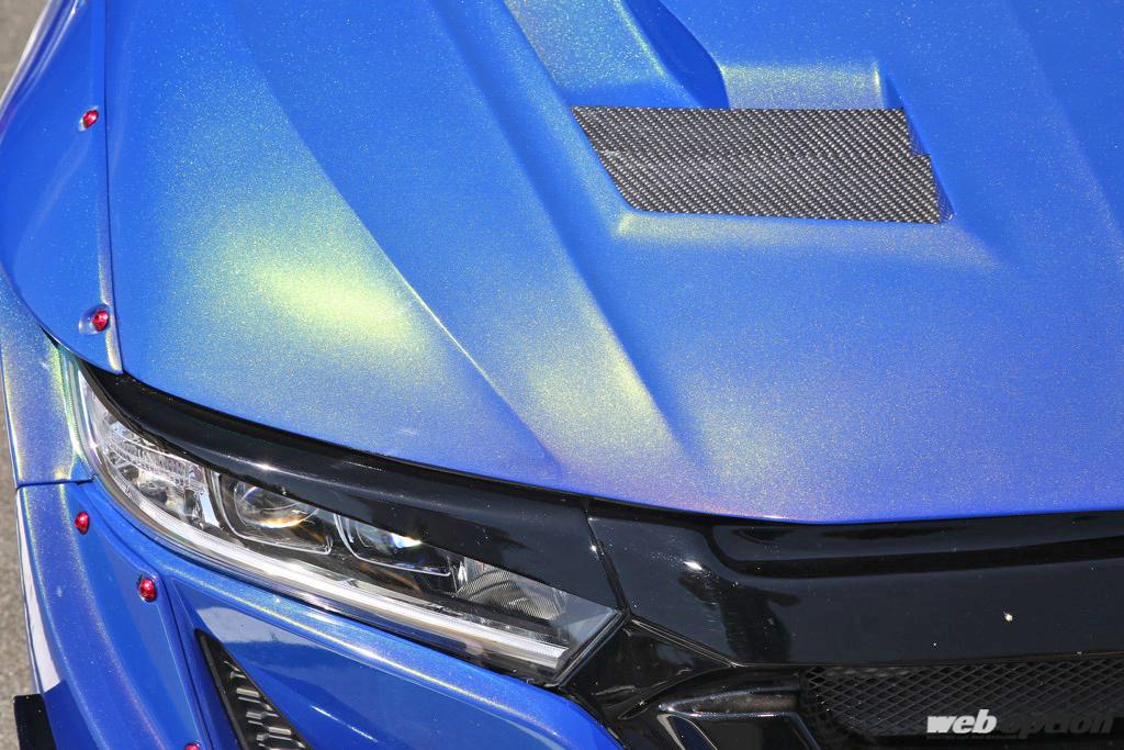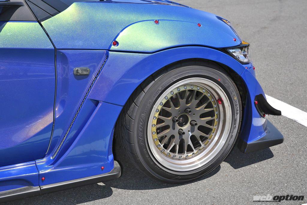 当初は鈴鹿サーキットを中心にサーキット走行を楽しむためにポテンシャル重視のカスタマイズを進めていたが、オフ会でのインパクトアップを狙ってワイドボディ化。エクステリアの構成パーツはM&Mワイドボディキットの他、リザルトジャパンのボンネットとエンジンフードも装着。角度によって色の変わるハーフマットのペイントは、“Ekishow”によるものだ。