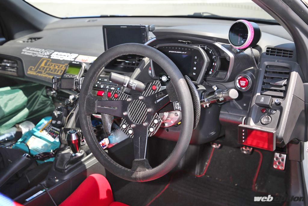 「サーキット用だからどこの製品か分からない」というホイールは、フロントが8.0J×15+15、リヤが8.0J×16+0。タイヤはアドバンネオバでフロント195/50、リヤ205/40サイズとなっている。サスペンションはHKSハイパーマックスMAX IV SPだが、スプリングを標準よりハードなフロント8kg/mm、リヤ10kg/mmに変更している。