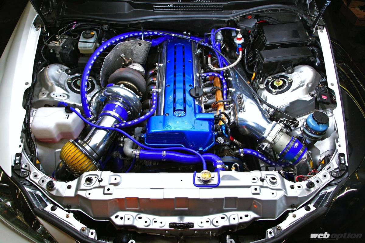 ドリフト業界に一石を投じたドリドレ仕様。心臓部は、2JZの腰下を流用した1.5J仕様にHKSのVカム(IN/EX264度)とTO4R改タービンをセット。F-CON Vプロで各種マネージメントを行い、最大ブースト圧1.5キロ時に526ps/74kgmを達成している。