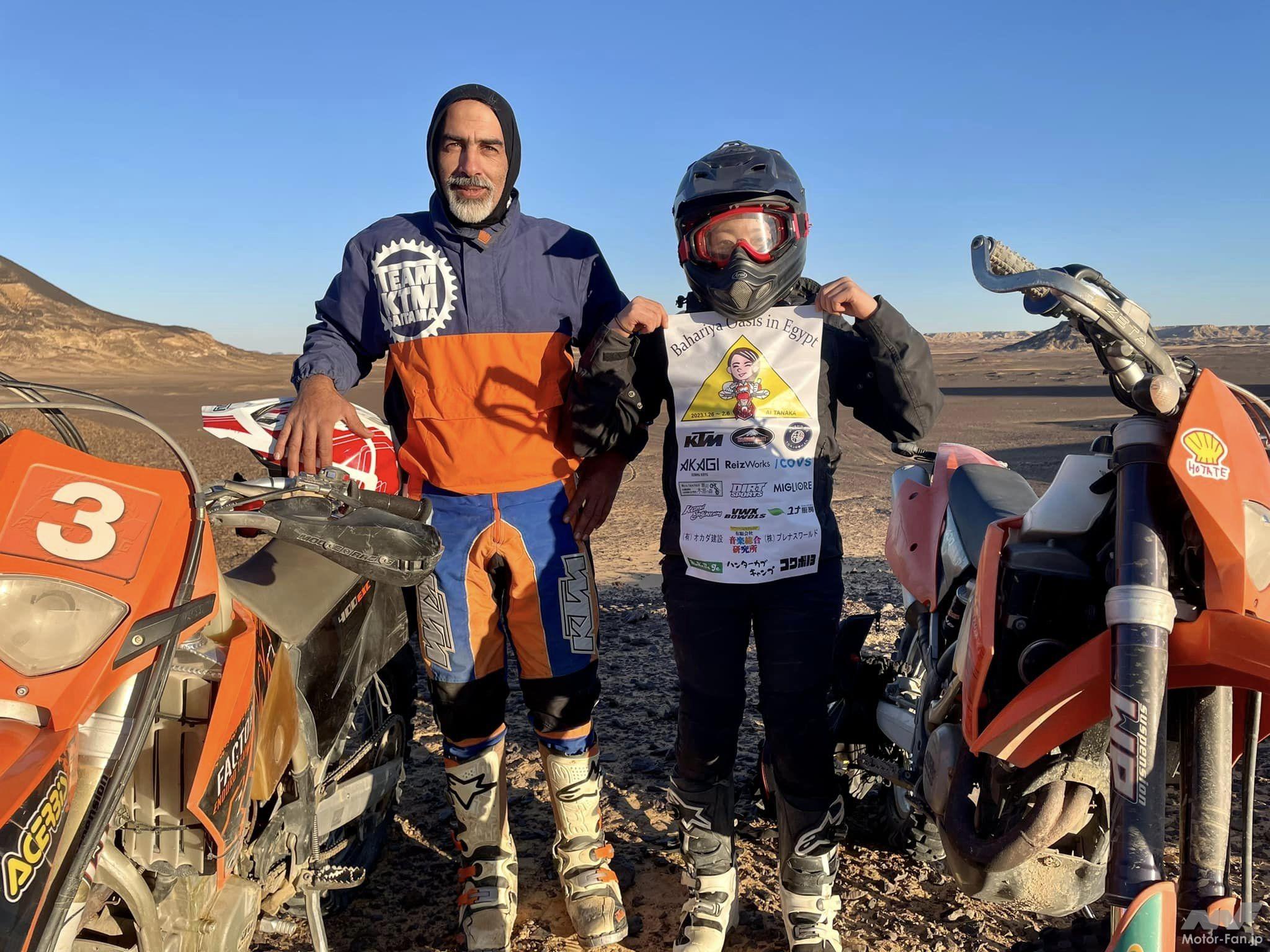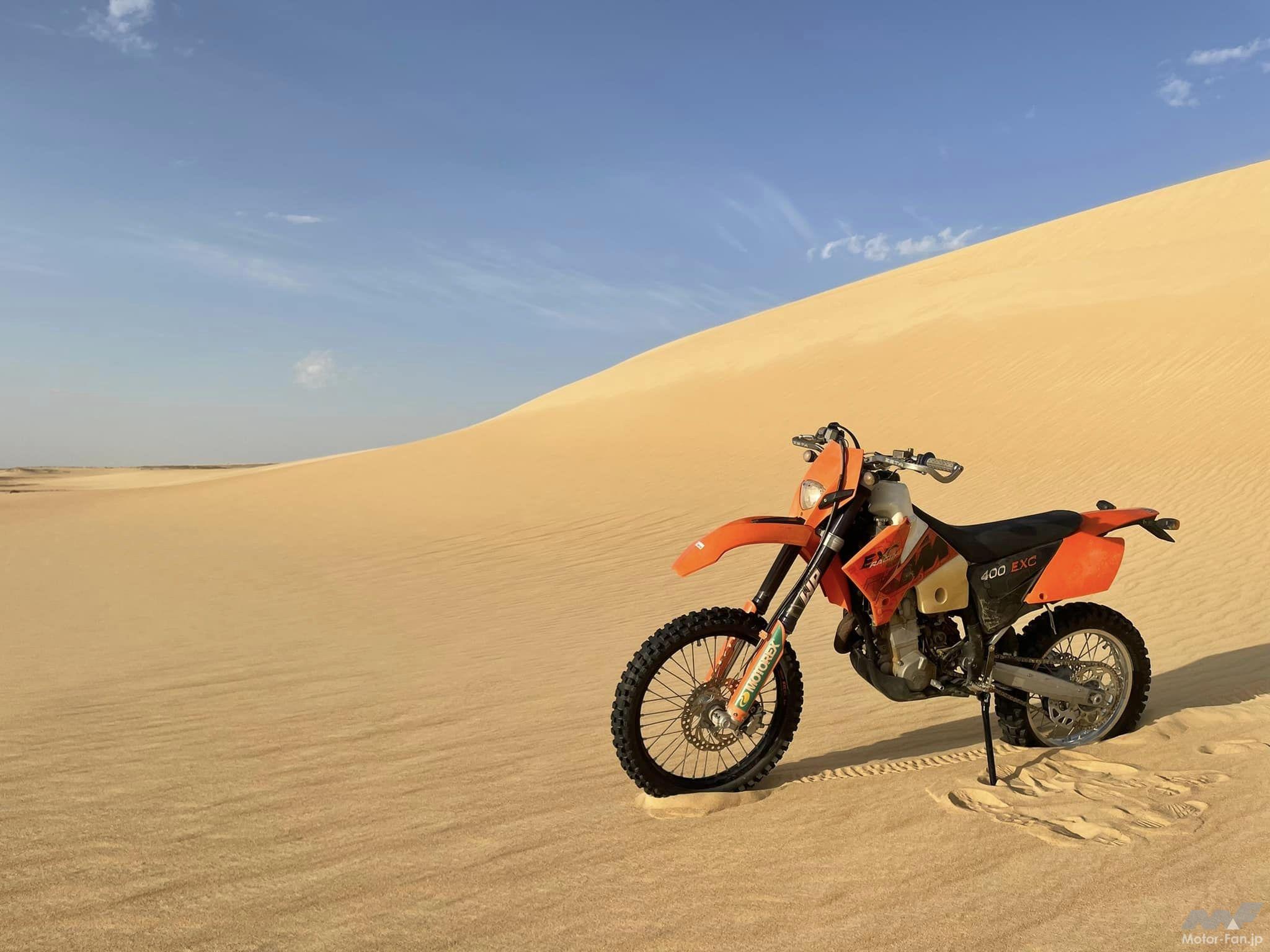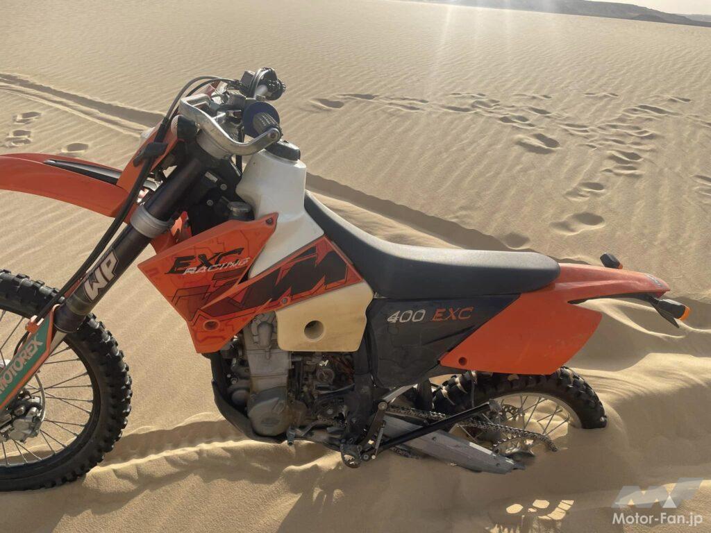 現地で用意されていたマシンは「KTM 400EXC」。両足が地面に着かないほどシート高が高く最初は苦戦しましたが(いわゆる「ガストン乗り」で対応しました)、一度走り出してしまえばこっちのもの。ライディングコーチはアミンさんというデザートライディングのスペシャリスト。このアミンさんは67歳でダカールラリーを完走した伝説的なライダー、フランコ・ピコのサポートもしていたという方で、ライディング&メカの技術が高いことはもちろん、教え方もものすごく上手です。
