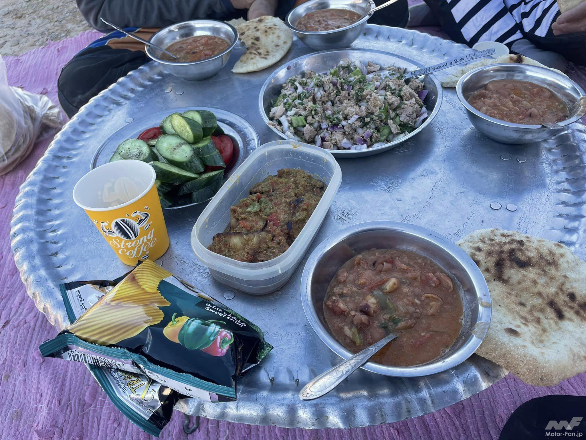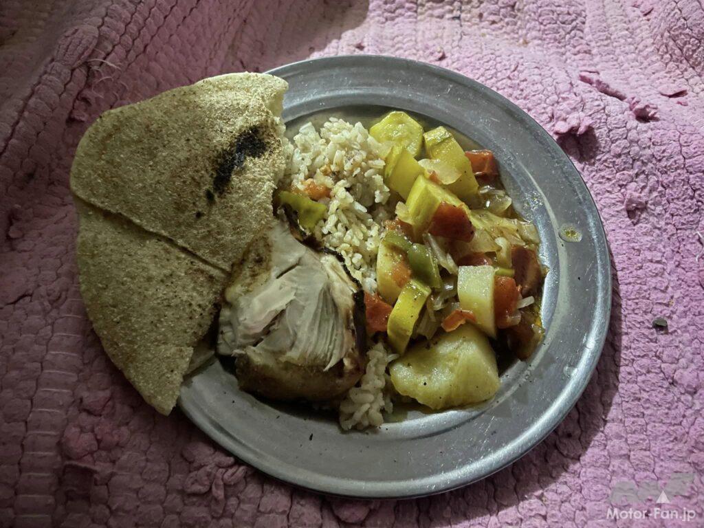 現地の食事。ピタパンような薄いパン「アエーシ」と野菜のペースト、煮物、牛肉の煮物などを良く食べました。美味しいです。