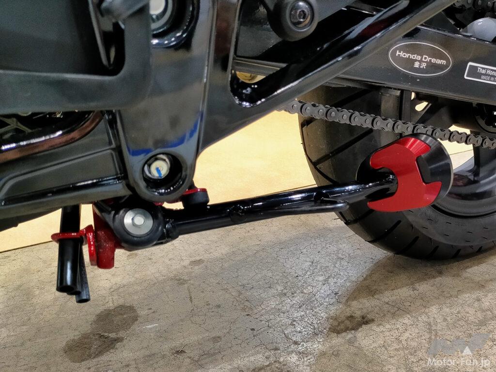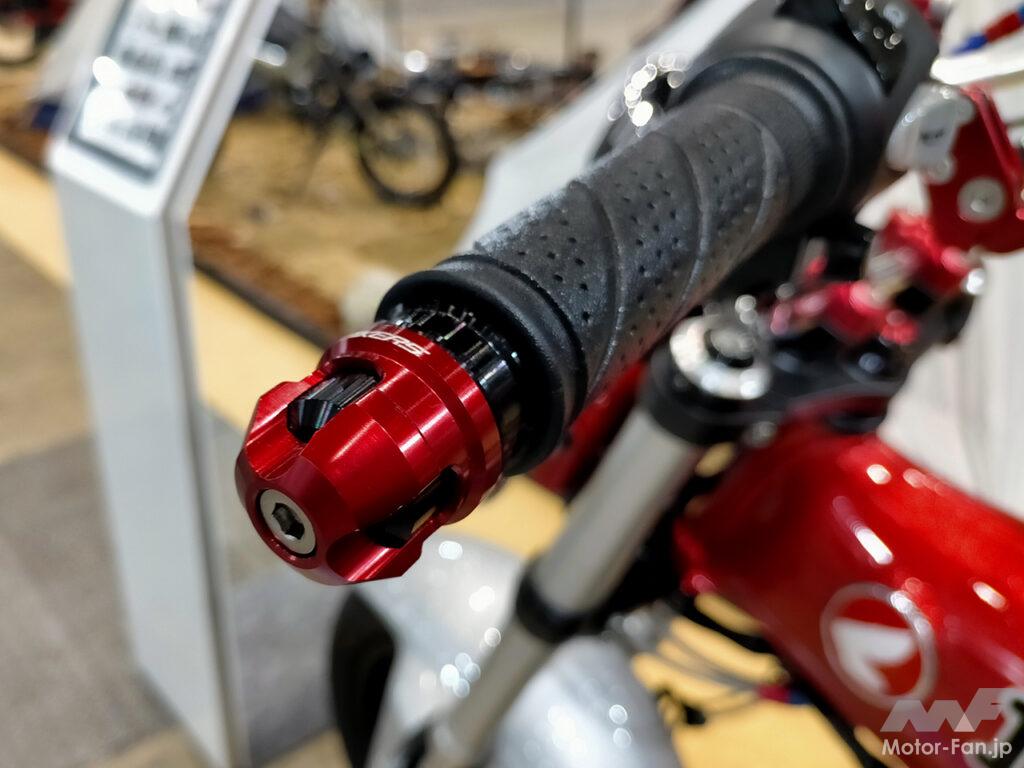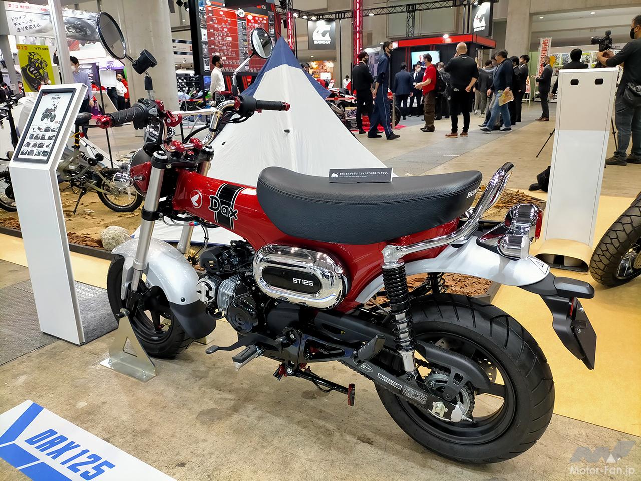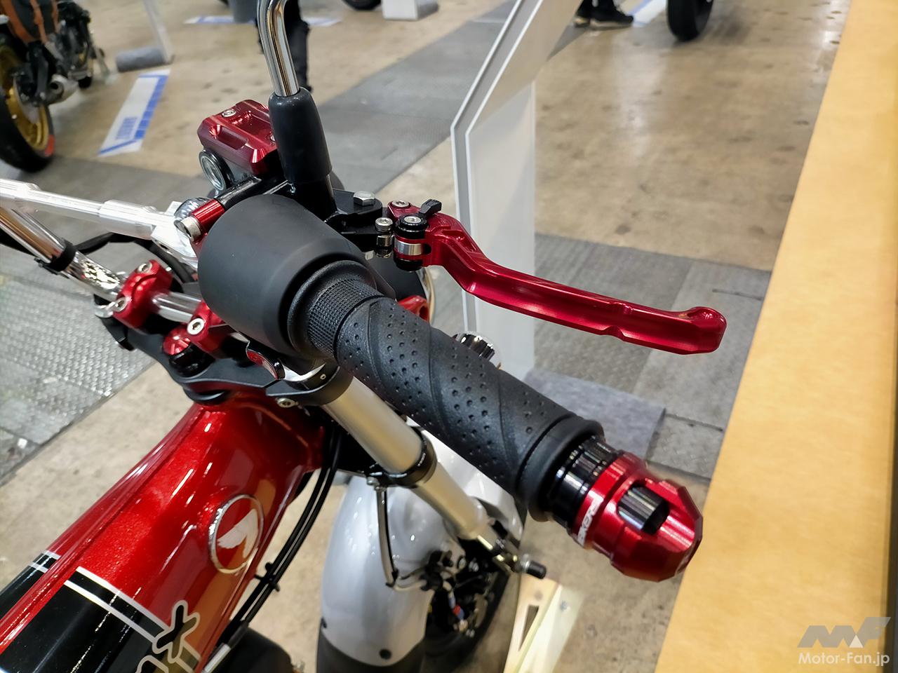 ダックス125改はカスタム度向上・利便性良し・動力性アップの三拍子/キタコ|大阪・東京モーターサイクルショー2023キタコがプロデュースしたホンダ ダックス125の最新カスタム。レッドカラーのボディに合わせ、アルミ削り出しのレッドアルマイトパーツ群でドレスアップしつつ、センターキャリアやリアキャリーの装着で積載性を一気にアップ。フロントディスクブレーキにはレッドカラーのニッシン製2ポットブレーキキャリパー、高級感と高性能を両立させたOVERレーシング製チタンマフラーを導入するなど、走りを意識したアイテムも随所に投入済みだ。 REPORT●北 秀昭(KITA Hideaki) キタコ https://www.kitaco.co.jp/