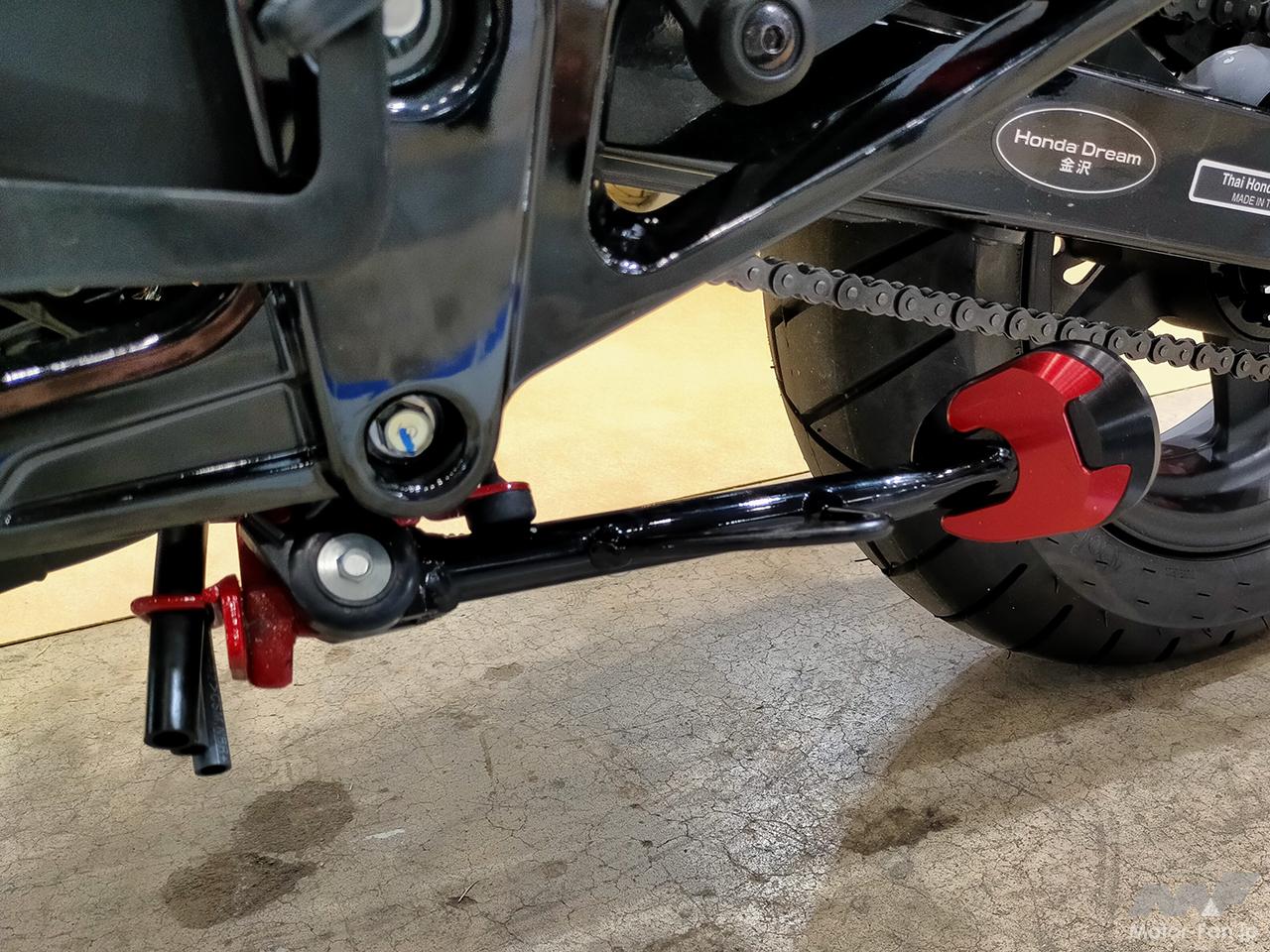 アルミ削り出し製。サイドスタンド接地面積を拡張し、悪路に停車する際の沈み込みを軽減。