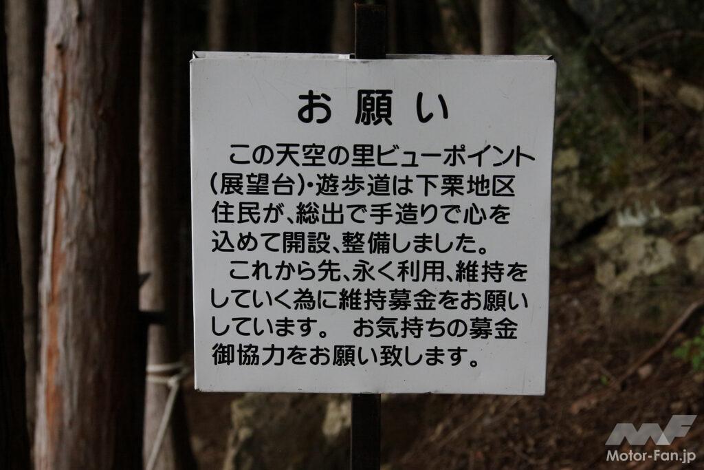 下栗の里にある駐車場はトイレはもちろん、観光案内所もあるので、食事や宿泊、そして何よりも絶景のビューポイントを聞いてみることがおすすめ。徒歩で20〜30分、林の中の遊歩道を登ると展望台がある。ポイントは3箇所あり、それぞれを回るガイドツアー(要予約)もあるので都合に合わせてゆっくりと大自然の散策を楽しむことができる。駐車場の近くには「高原ロッジ下栗」や食事処の「はんば亭」がある。また、152号を15kmほど南下すると道の駅「遠山郷」もある。見晴らしの良い周辺道路の南アルプスエコーラインも快適だが道幅が狭く、対向車にも出会うから十分に注意して進むよう気をつけたい。
