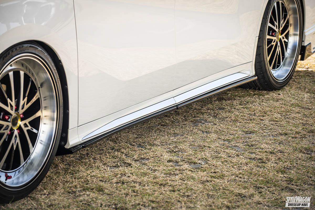 そんなゼウスには、待望論が根強かったエグゼクティブラウンジ&タイプゴールド用も設定される。それがこの1台。エグゼクティブラウンジとエアログレードのビジュアル上の違いはサイドにあり、通常車には装備されないメッキガーニッシュが備わっている。そのサイドガーニッシュに対応させるべく専用ステップを用意している。