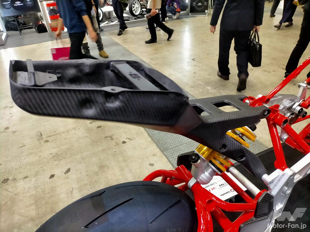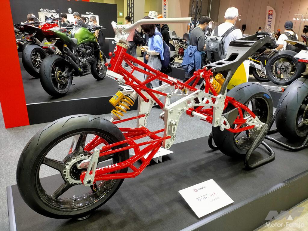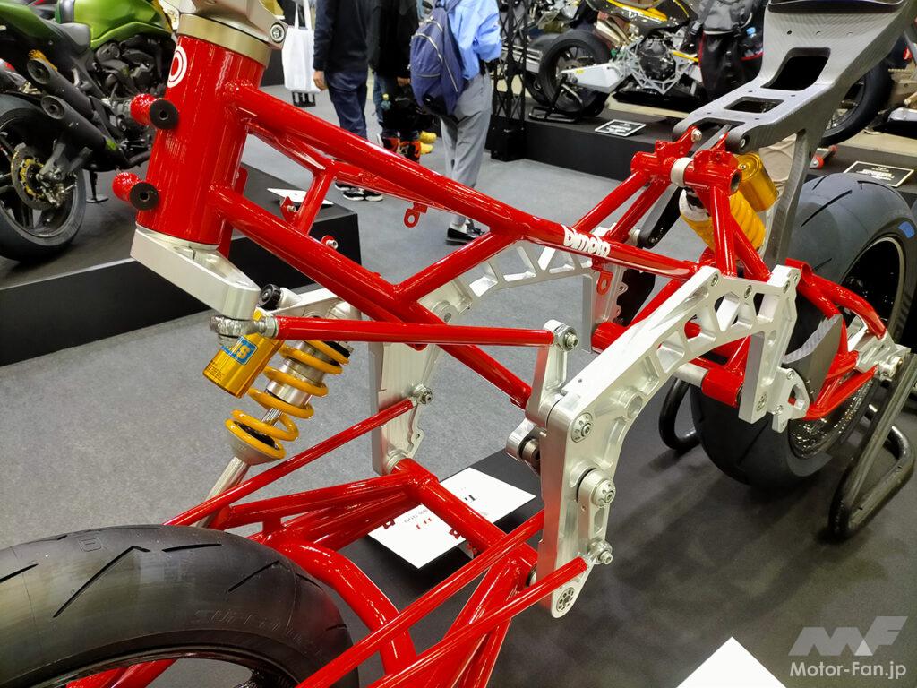 フロントにはクロームモリブデンパイプを素材にしたスイングアームを採用。太さの異なる複数のパイプをトラス形状に組み合わせ、緻密に剛性をコントロール。