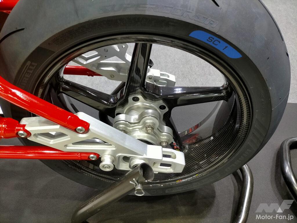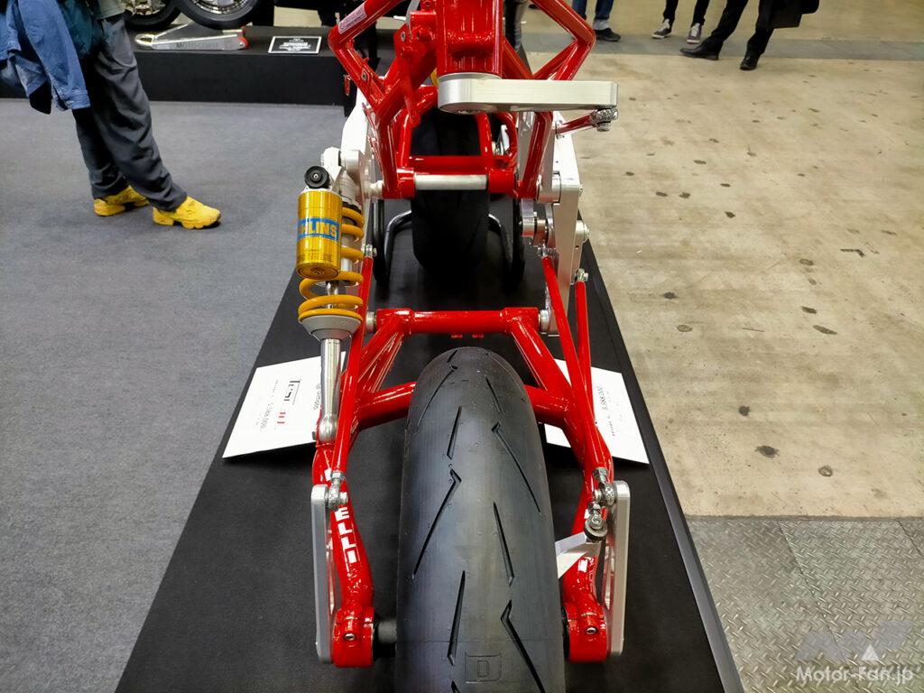メインフレームには、Ω(オメガ)型の削り出しアルミニウムプレートを採用。最小限の重量と高い剛性に加え、特別なマシンであることを主張。豪華なフレームには、104.7馬力(TESI-3DC)を発揮するドゥカティ製の空冷L型2気筒2バルブ・デスモドロミック・エヴォルツィオーネ1078cエンジンを搭載。