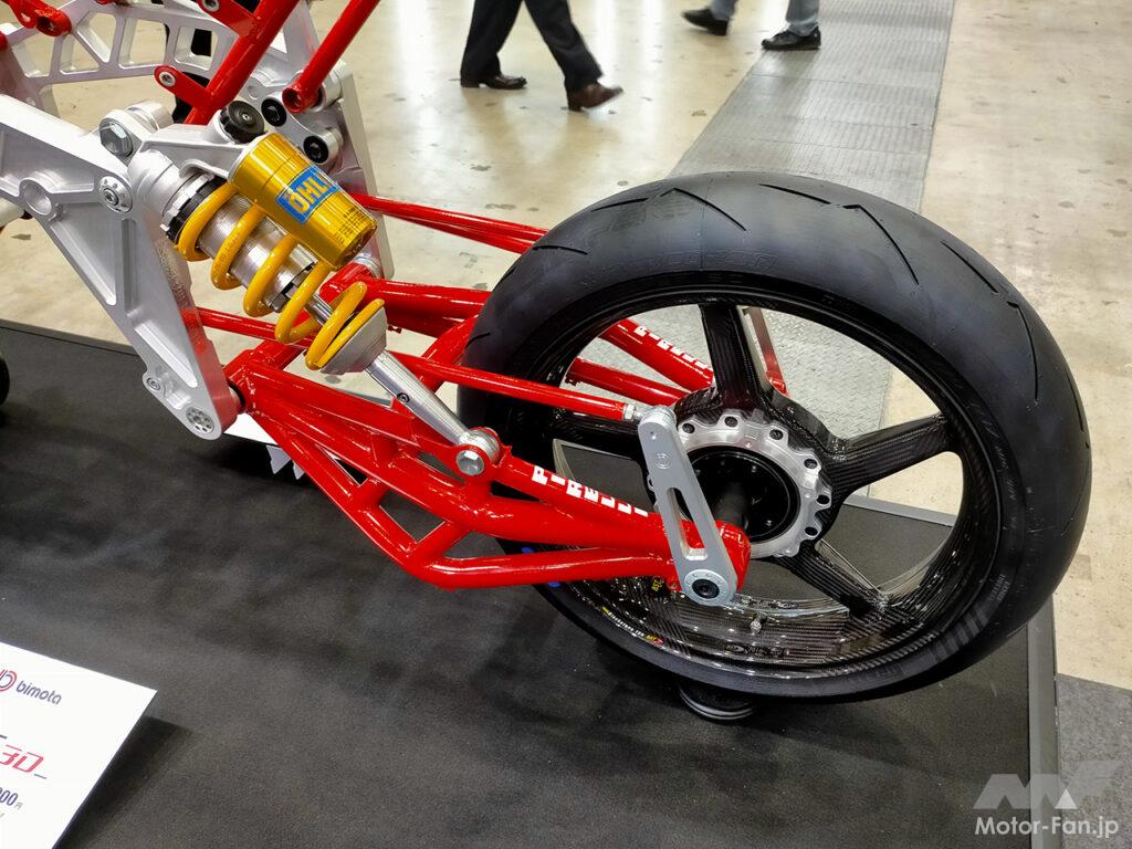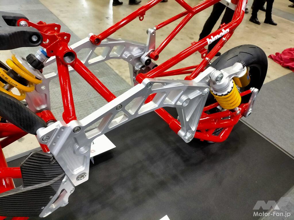 フロントのスイングアームには緩衝装置としての役割のみを持たせ、操舵機能はフロントホイールハブに集約し、それぞれの機能を独立。これにより互いが干渉することなく、その性能を最大限に発揮することを実現した。