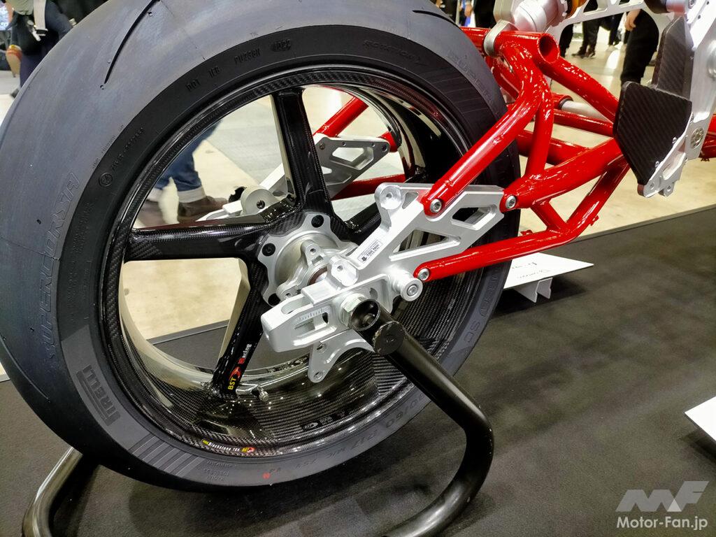 リアスイングアームはフロントと同じく、クロームモリブデンパイプを採用。これにアルミ削り出しのアクスルプレートを組み合わせ、高い操安性を獲得。前後ホイールはブラックアウトされ、レッドカラーの美しいスイングアームセクションを引き立てている。