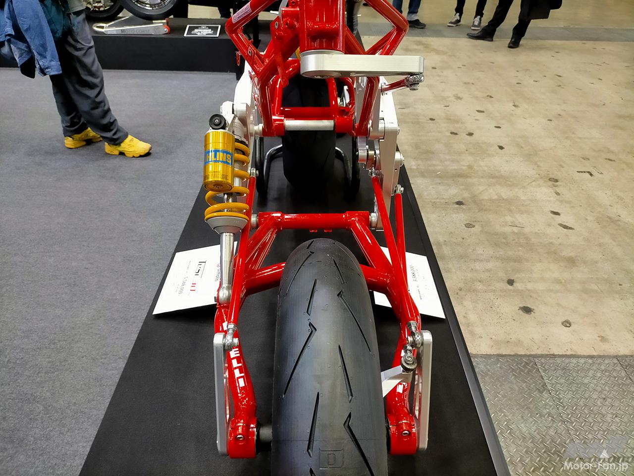 リアスイングアームはフロントと同じく、クロームモリブデンパイプを採用。これにアルミ削り出しのアクスルプレートを組み合わせ、高い操安性を獲得。前後ホイールはブラックアウトされ、レッドカラーの美しいスイングアームセクションを引き立てている。