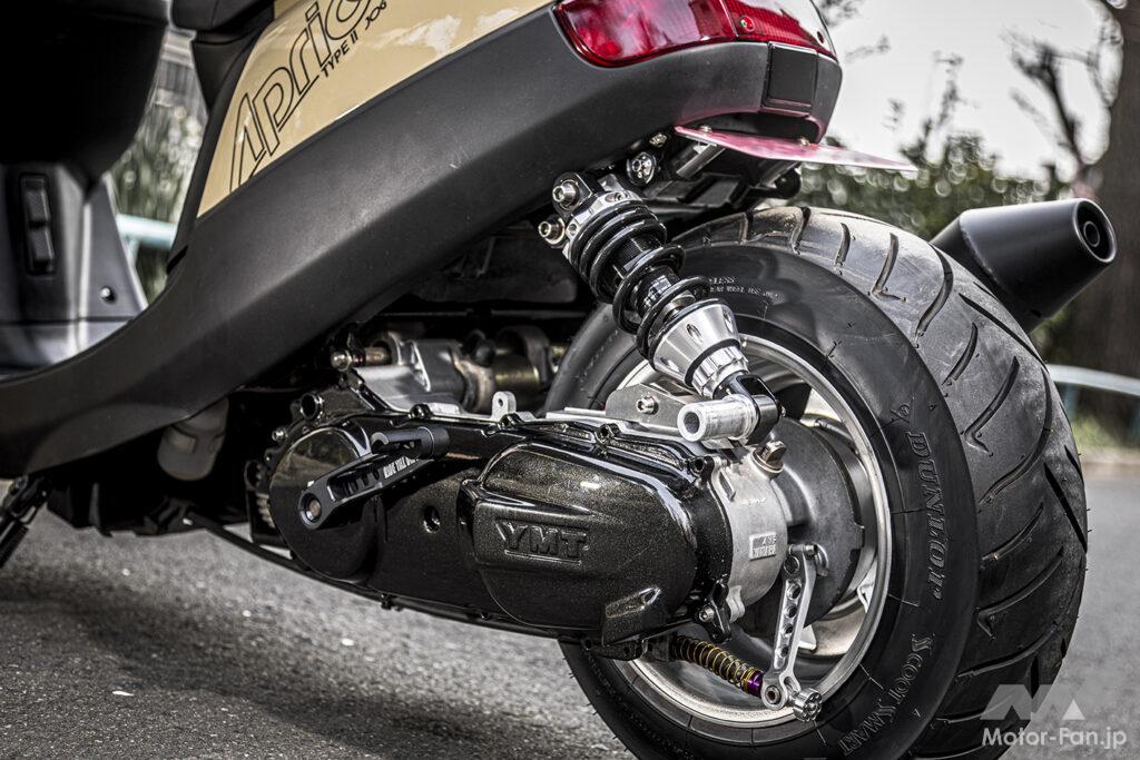 まず注目したい点が、ワイド化されたリヤホイール。ノーマルエンジンのままではホイールが干渉してしまうため、BW’S100エンジンにスワップ。四輪用ホイールとしておなじみのSSRマーク1を履き、リヤ周りを6J化を実現しています。