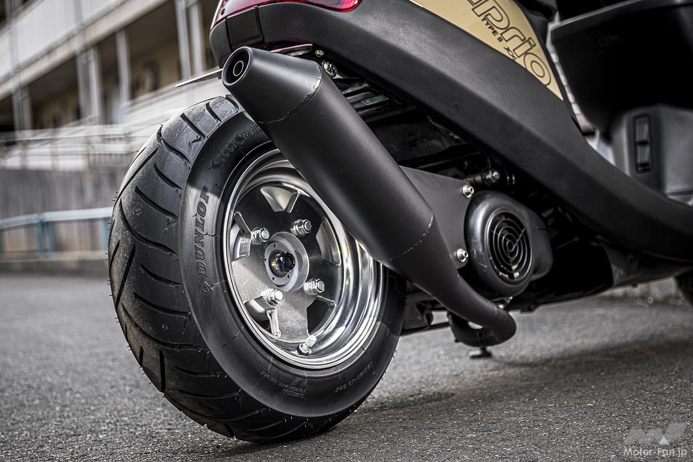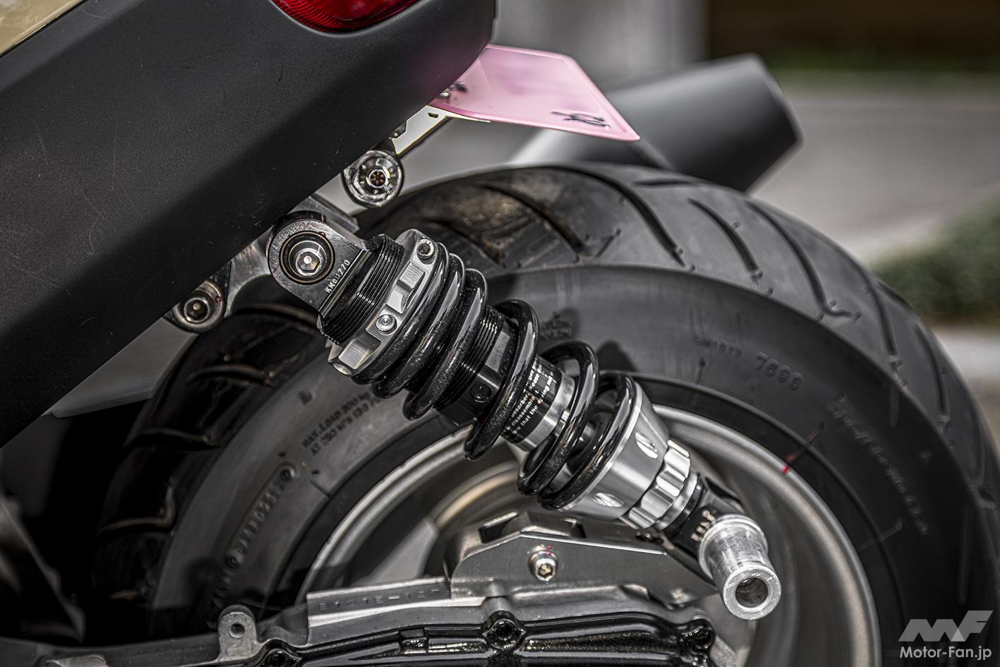 フロントホイールはデイトナ製10インチ。フロントフォークはズーマー用を加工流用しローダウンし、これに合わせてリヤ側もKN企画製車高長付きリヤショックを用いることで、バランスよく車高を下げています。