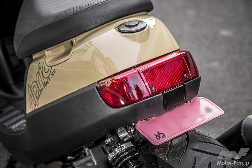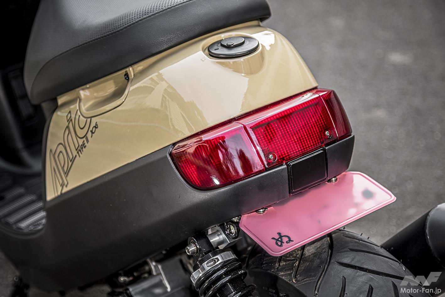 ベージュ系に塗られたペイントは千葉県にあるペイントショップLiB Designが担当。前後のカウルに施された「Aprio」のロゴはステッカーではなく塗装によるもの。さらに純正キャリアの取り付け穴を埋めるといった緻密な仕上げも魅力の一つです。