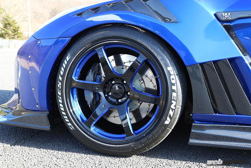 ホイールはボルクレーシングVR.G2の20インチで、ボディに合わせブルー&ブラックでリペイント。ホイールの奥に収まるエンドレスのモノブロックキャリパーもブルーロゴをチョイスするなど、カラーコーディネイトは徹底的だ。
