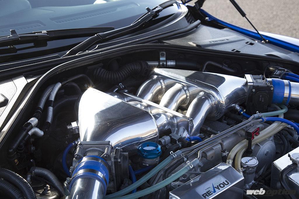 一方の心臓部は、ノーマルタービンの性能を余さず引き出せるように、エンジン本体はノーマルのままサージタンクまで含めて各部の効率アップを追求した600ps仕様を創出。後のタービン交換まで想定したパーツチョイスだ。