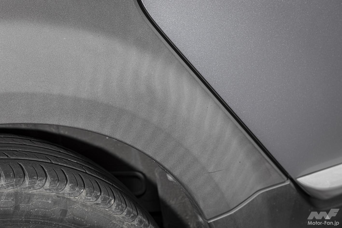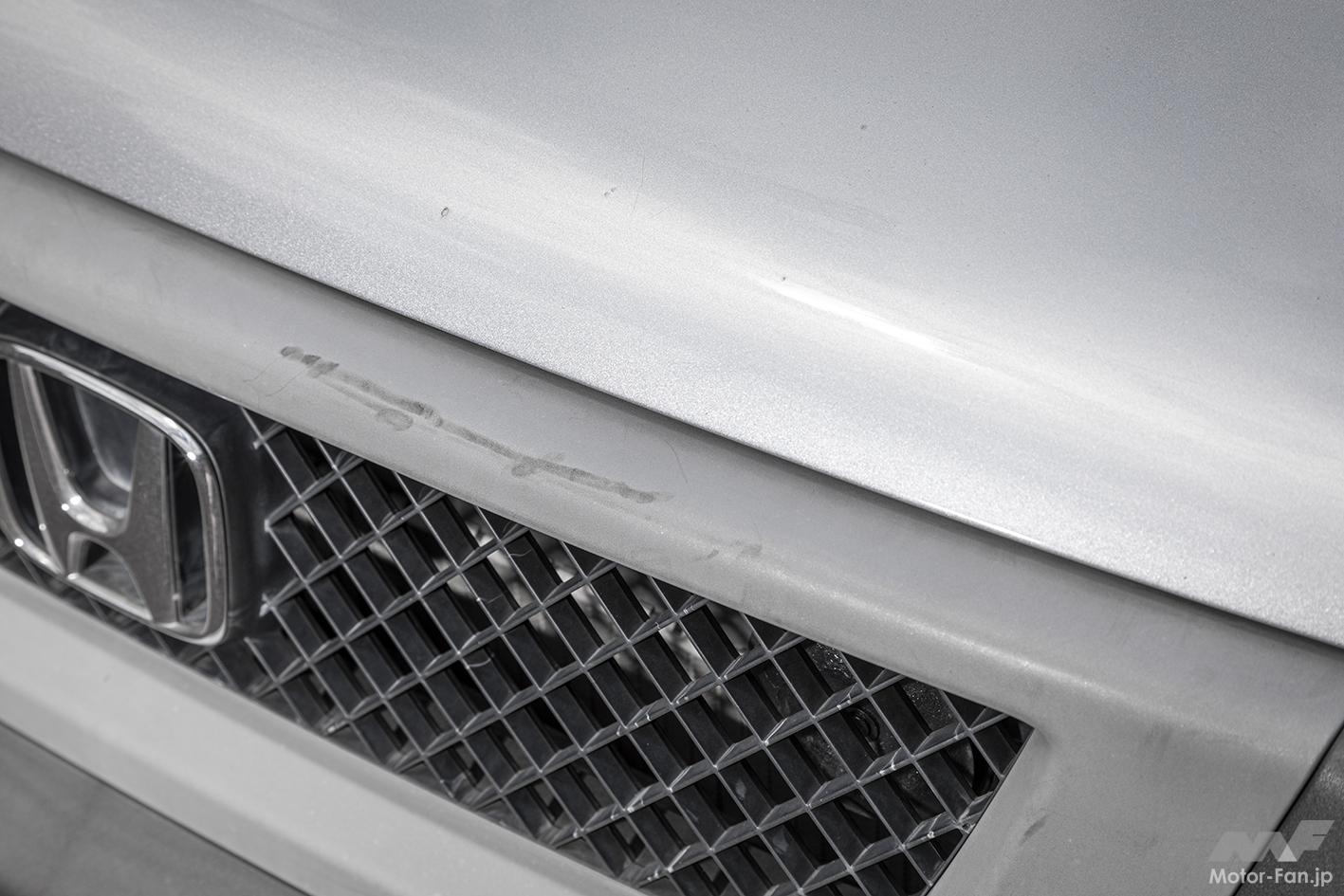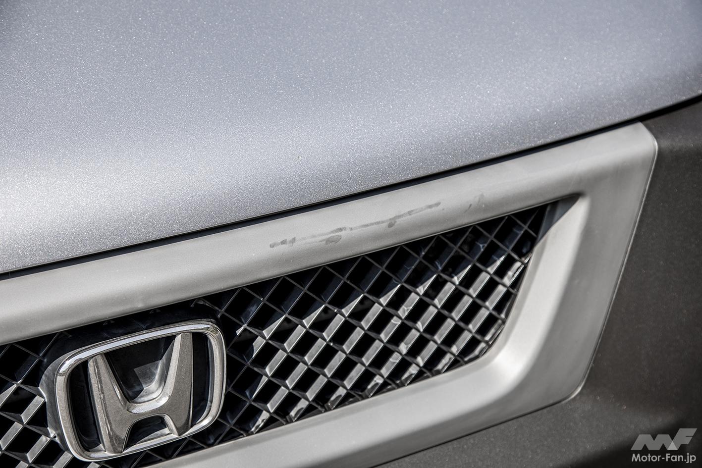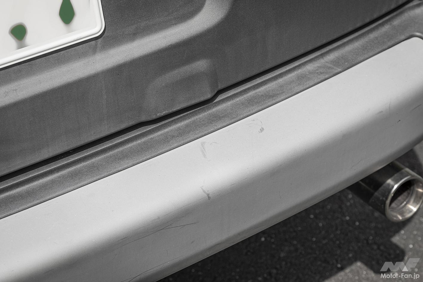 筆者の自家用車、ホンダ・エレメント(2003年式)も樹脂パーツだらけなので試してみることに。劣化によって現れた白い色あせと、まるで肉割れのような線をなんとかしたいところ。