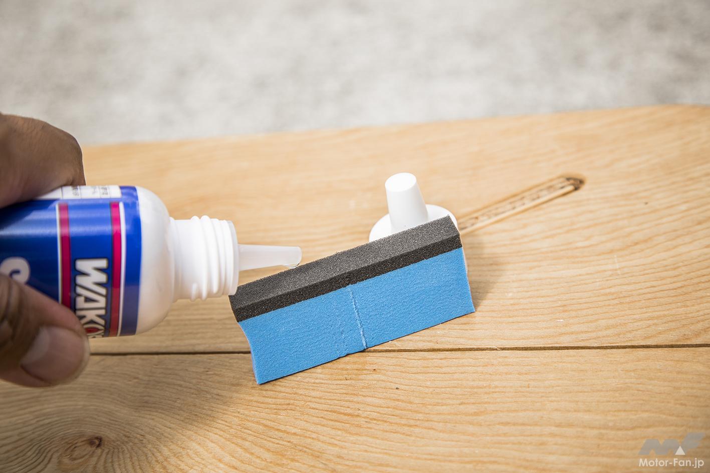 付属のスポンジの黒い部分に液体を塗布し、均一に塗り込む。