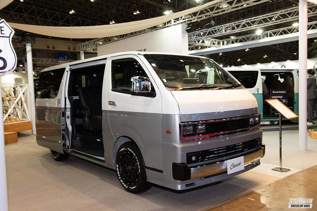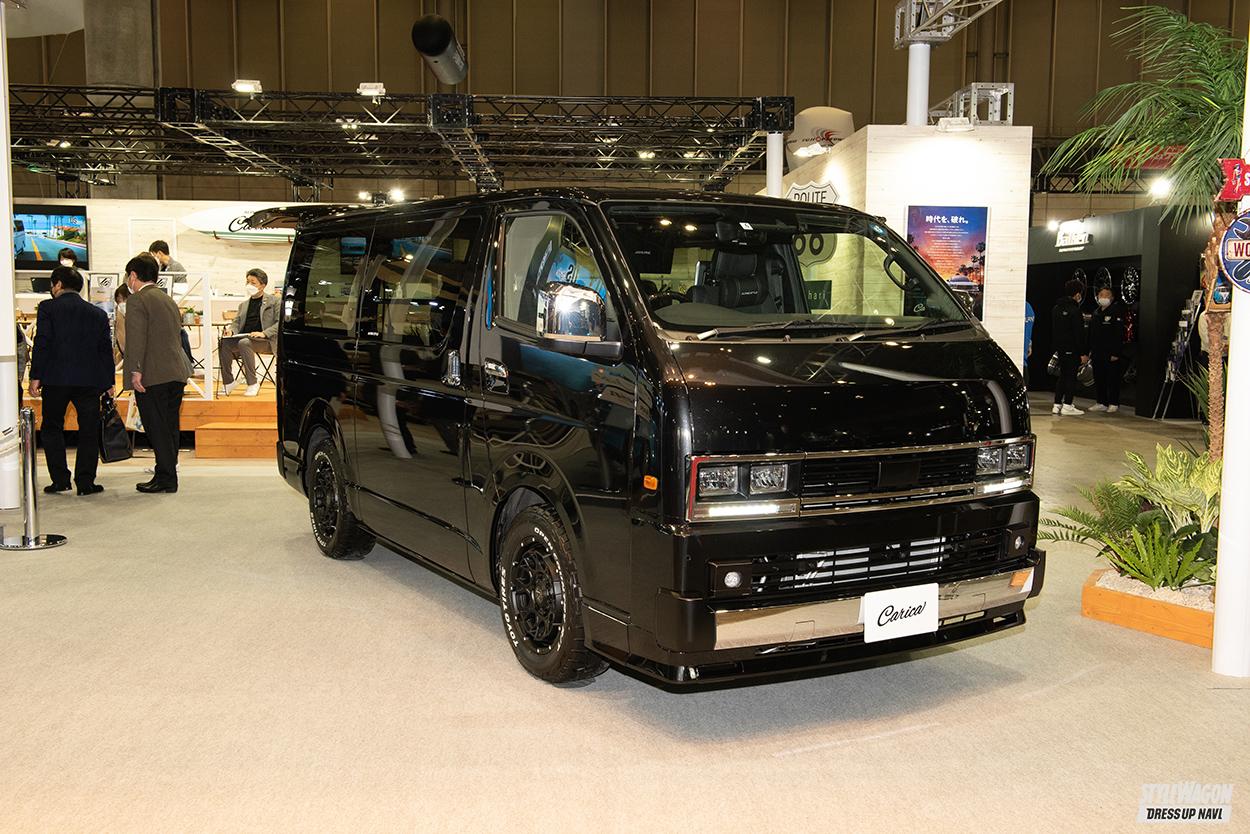 2台同時発表で、まず「Carica(カリカ)」。コチラはハイエースの標準ボディがベース。カリフォルニアの海と空、風が似合う、角形4灯ライトとメッキバンパー、カラーアレンジで魅せるコンプリートカーとなっている。