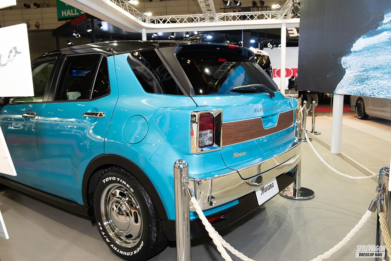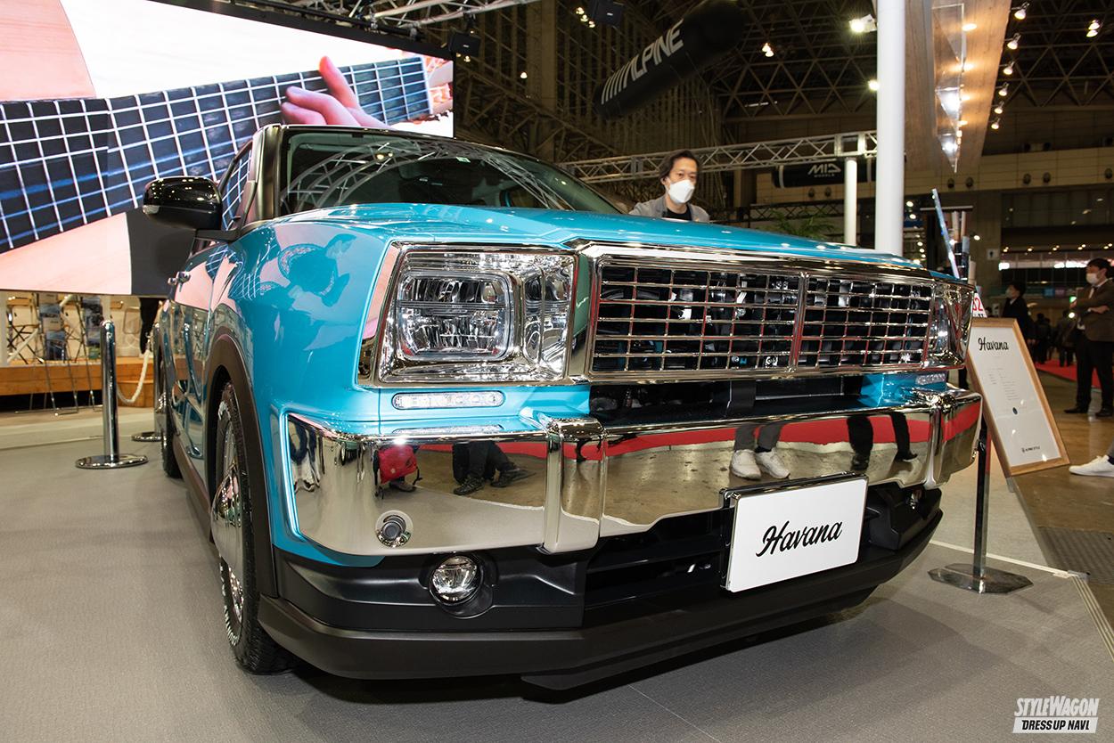 一方「Havana(ハバナ)」は、トヨタのライズがベースだ。レトロなクラシックカーがいまなお現役で走るキューバへの憧憬の念を込めた1台で、角形ライト、グリル、メッキバンパーなどで魅せる、スクエアかつワイド感のあるルックスがポイント。