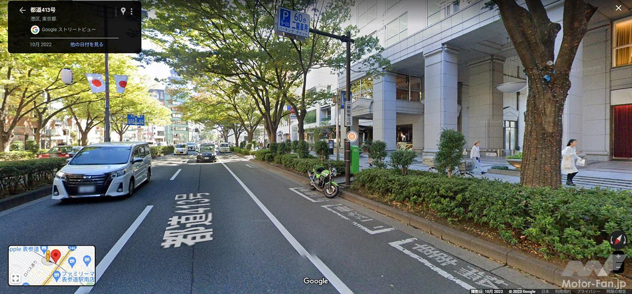 メインストリートの表参道(都道413号)と、青山通り(国道246号線)が交差する「表参道交差点」から、明治通り側のひとつ手前の信号までの区間には、全国でも珍しい、知る人ぞ知るパーキングチケット式のバイク専用路上駐車スペースがある。上下線合わせて34台のバイクが駐車可能だ。