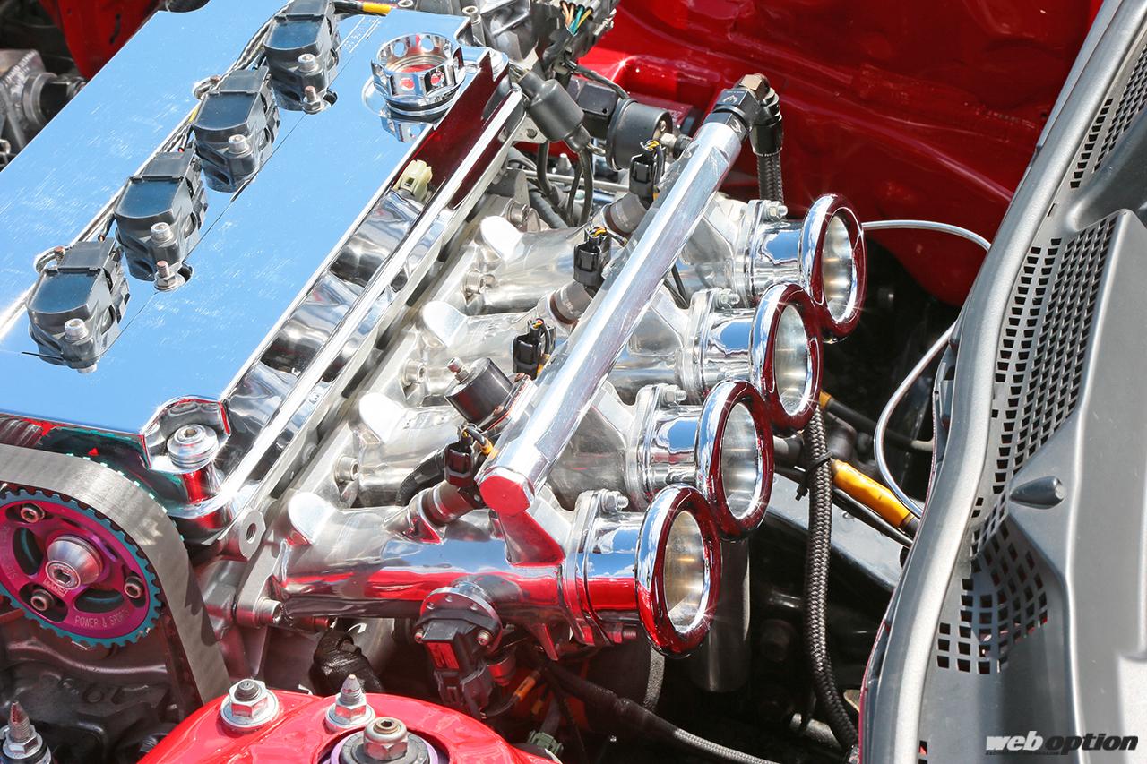 そして注目のエンジン。以前はターボ化されたゴールドのエンジンベイだったが、“B型エンジンらしさ”を追求する方向性でリメイクを敢行。ターボユニットを外すとともにボディ同色のミラノレッドで塗装し、さらにスッキリとしたエンジンルームには新たなアイデンティティとして4連独立スロットルが配備された。