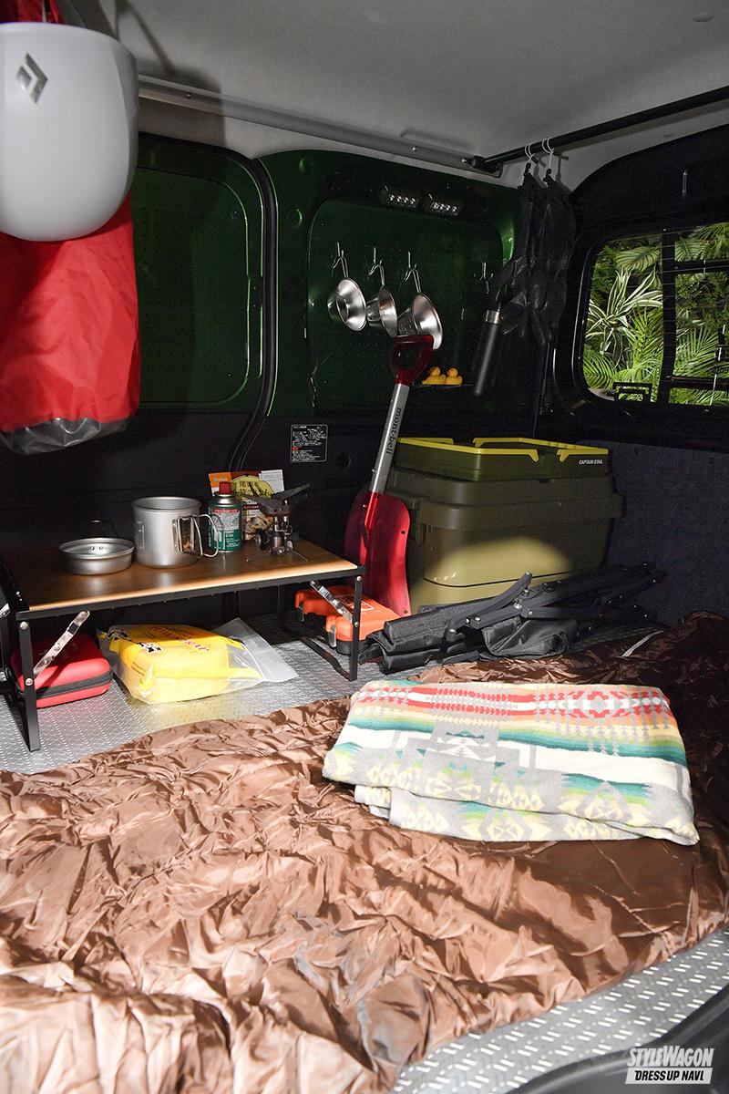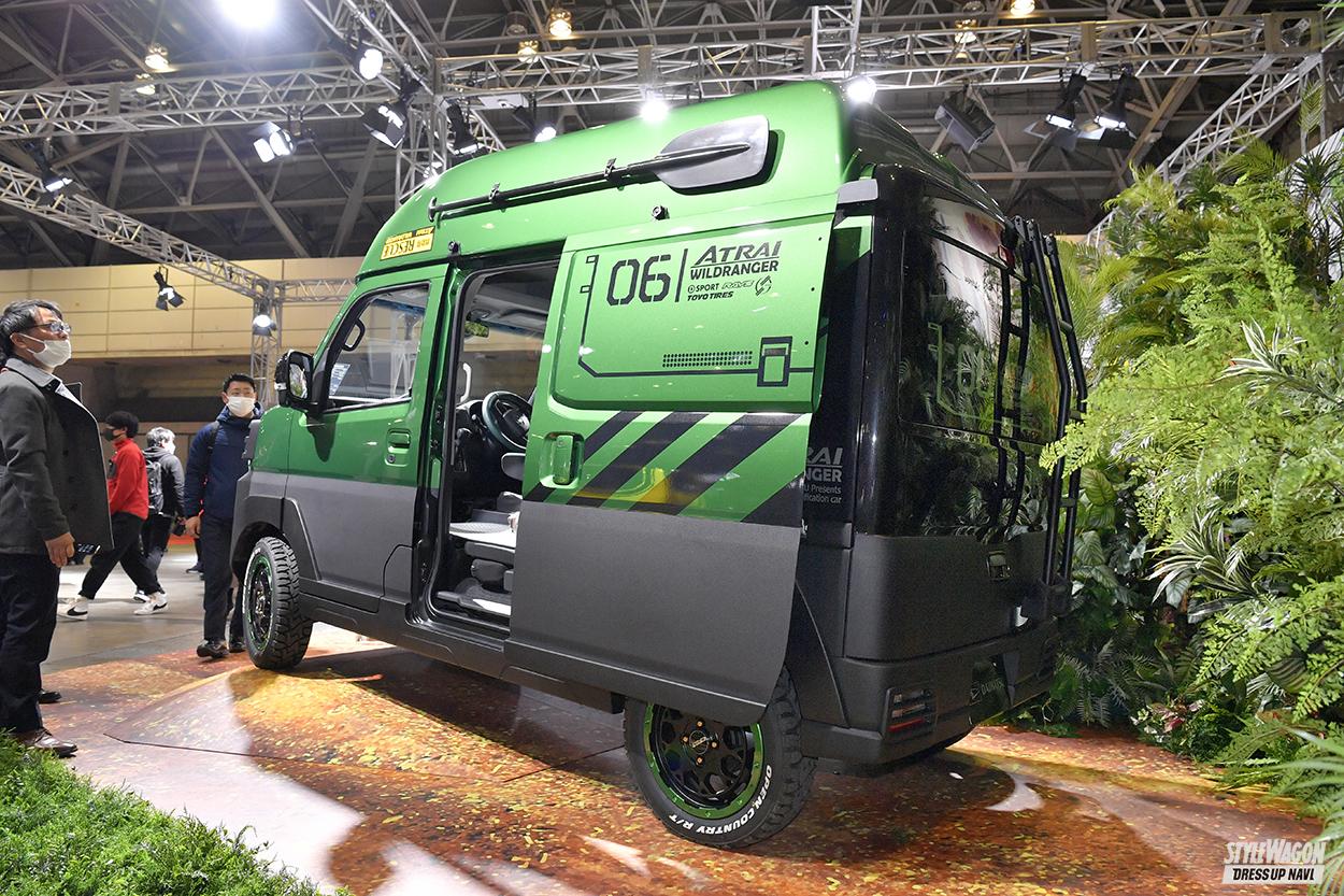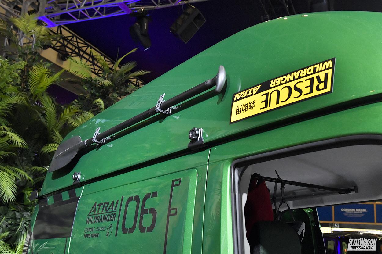 カスタマイズのテーマは「動く探検基地」。アウトドアのもう一歩奥まで踏み込んで楽しめる仕様がコンセプトだから、足元はリフトアップ、牽引フックにワークライトとオフシーンで役立つ装備が盛り沢山。ルーフのボートは山奥のダム湖などで釣りを楽しむのにピッタリだし、万が一の水害時にはレスキューボートとしても大活躍。大人ふたりが乗れるサイズなのも安心だ。