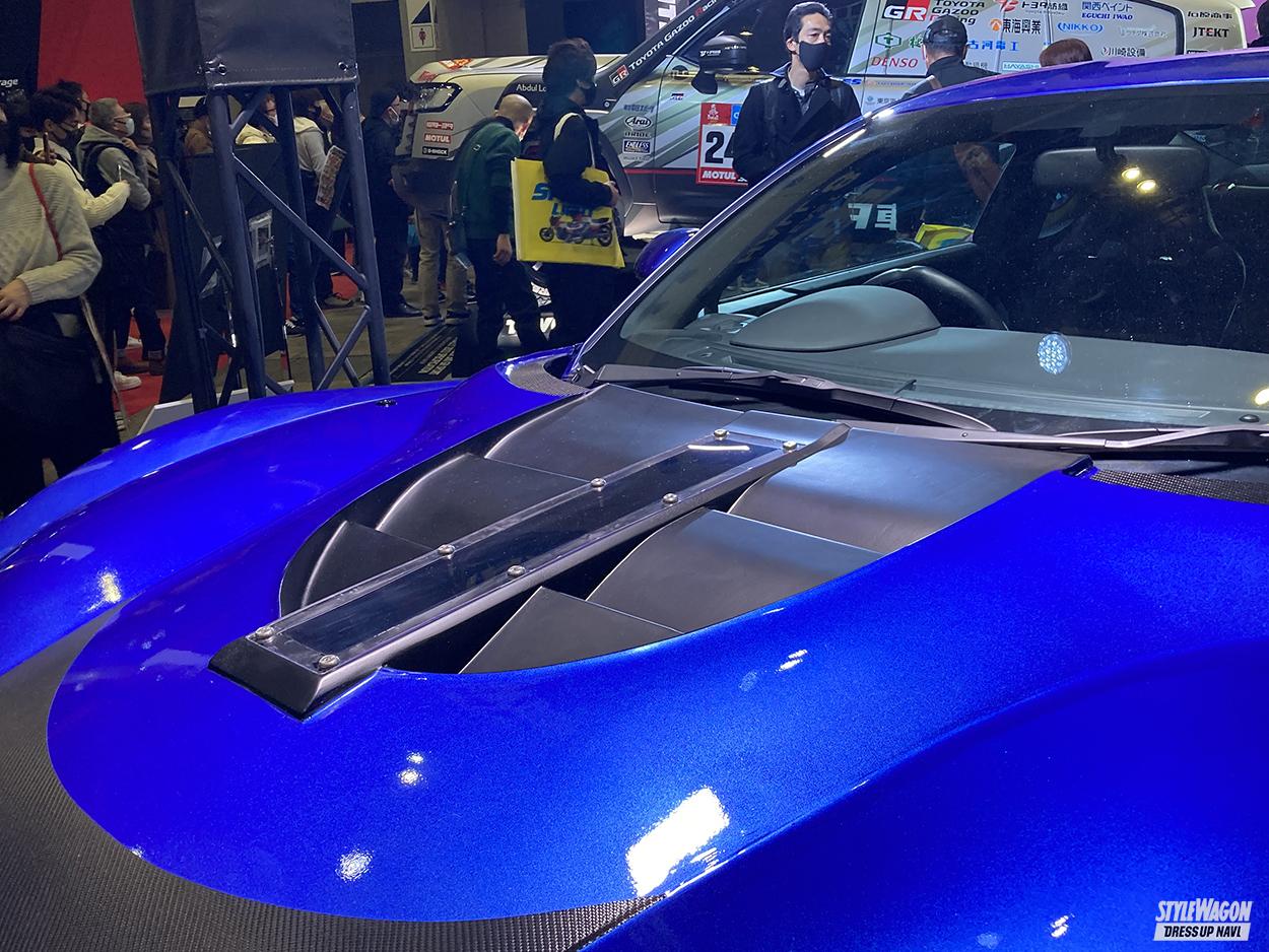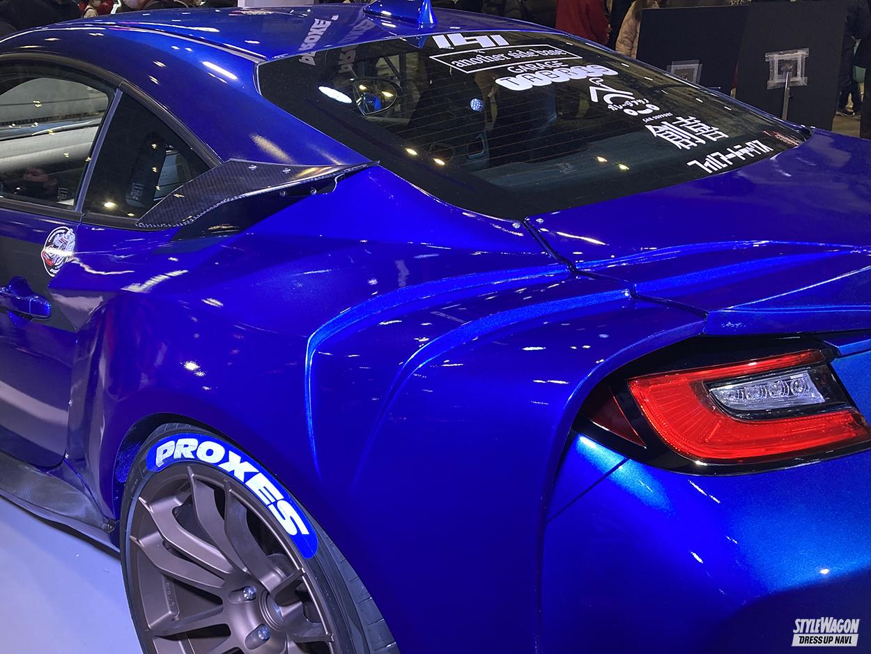「どちらかと言えばラグジュアリー指向だった過去2モデルに対し、SD3はドリフトやレースといったハードユースを想定したコンセプトでまとめています」と語るのはSデザインの佐野代表。興味深いのはフロントには大型のアンダーウイングが装着されているものの、リアにはモータースポーツシーンでは定番とされているGTウイングは備わらず、フィン形状のスポイラーのみとなっている点。これはGTウイングに頼らず、ボディ全体の空力でダウンフォースを稼ぐ、という考え方に基づいたもの。もちろんサーキットだけでなくストリート用としても販売予定。SD1、SD2同様、人とカブるカスタムは嫌いという超個性派ユーザーの注目を大いに集めそうだ。