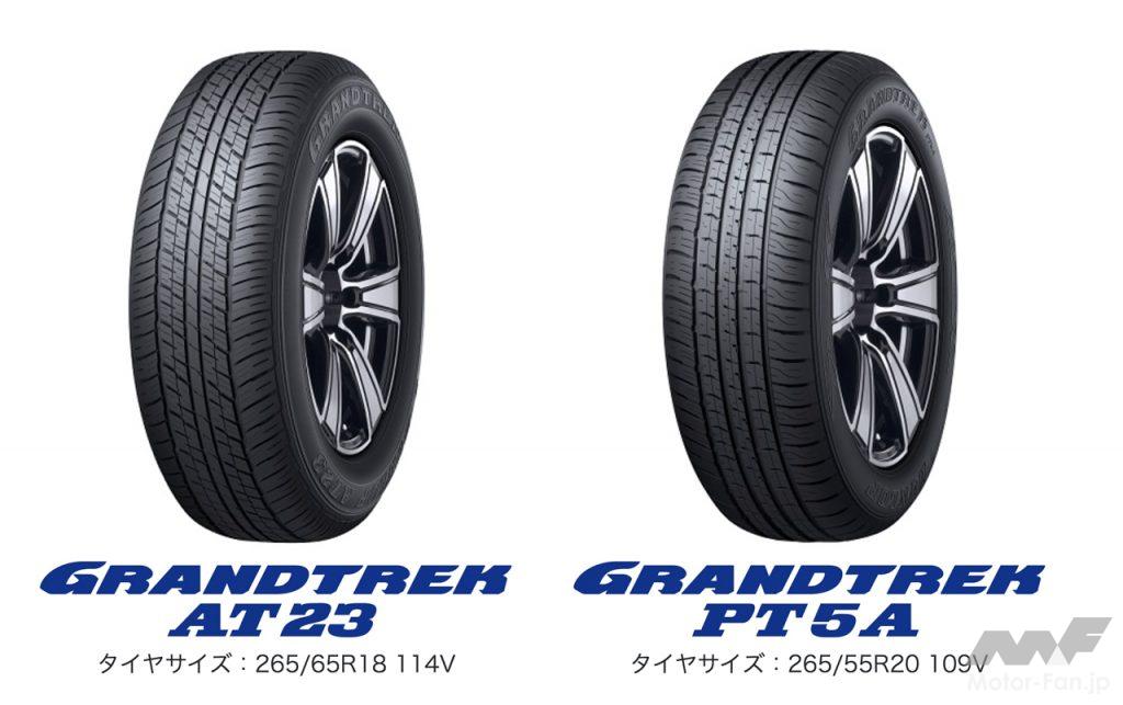 今回、新車装着される「グラントレックAT23」および「グラントレックPT5A」は、耐久性や信頼性などランドクルーザーの装着タイヤとして求められる基本性能を維持しつつ、従来よりも低燃費性能、耐摩耗性能に優れた新トレッドゴムを採用。