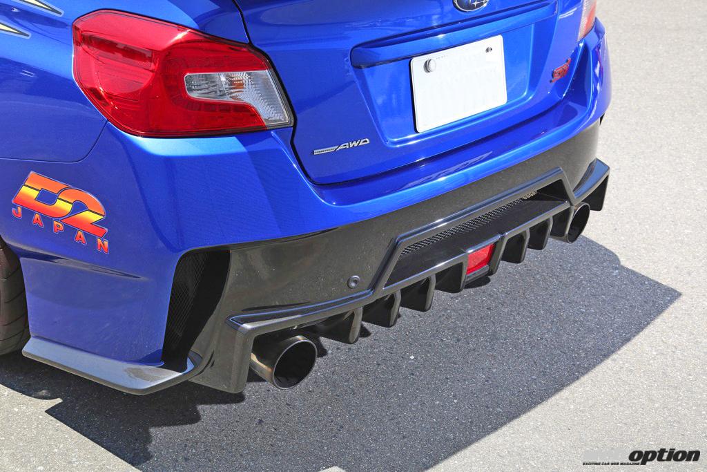 アグレッシブな造形が印象的なリヤバンパー(10万430円)は、フロア下の空気をスムーズに引き抜くためのディフューザー一体形状を採用。パラシュート効果を抑制するために、バンパーにはアウトレットダクトも設けられている。
