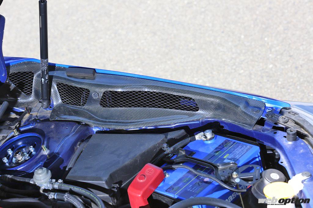 FRP製(9万6800円)の他、ドライカーボン製(22万円)もラインナップするボンネットは、熱気を排出するためのアウトレットダクト付き。センターバルジ一体型のデザインとなっており、効率よく吸入空気を取り入れられるのもポイントだ。雨水の浸入を防ぐカバーも付属するので、エンジンルーム内が汚れてしまう心配もない。