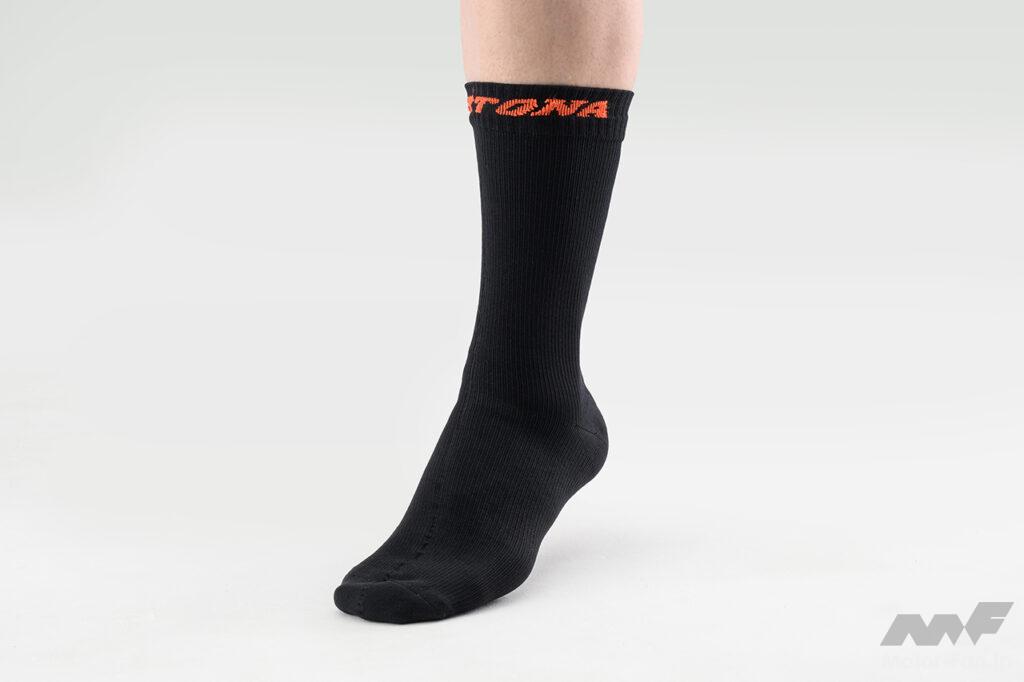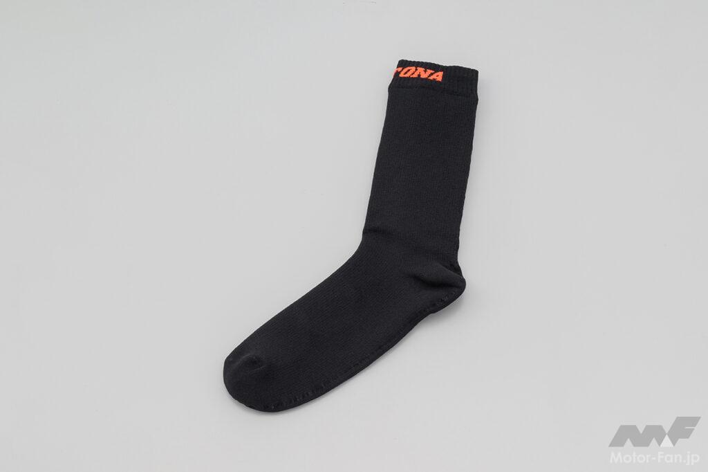 写真は雨の日の不快感を解消してくれる、完全防水タイプのツーリングソックス。梅雨の時期はもちろん、オールシーズンに対応しているのがポイントだ。このソックスは、防水性と透湿性を両立。伸縮性を兼ね備え、履き心地も抜群。