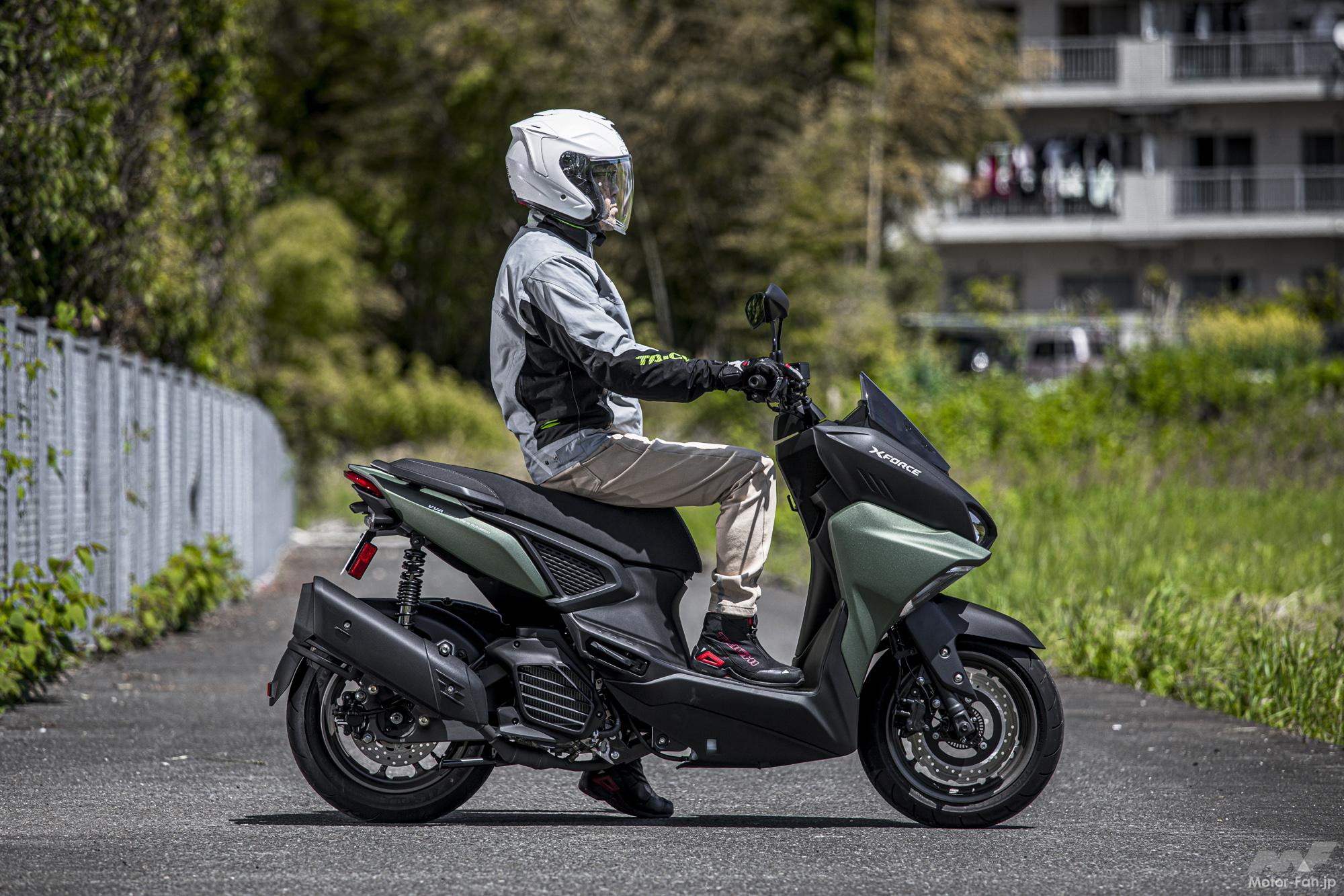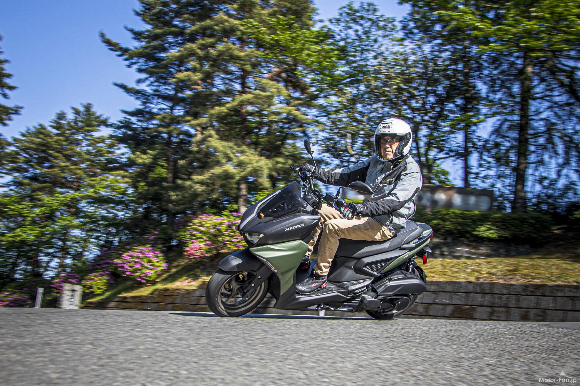 私見ながら、スクーターにスポーティなハイパフォーマンスは無用だと考えているが、それでも峠道を行く時、少し両肘を張り出し前傾姿勢で身構え、コーナーを攻めてみたい気分にさせられてしまった。各コーナーをそのように駆け抜けても軽快かつ何ら不安を覚えない素直な操縦性が楽しめた。