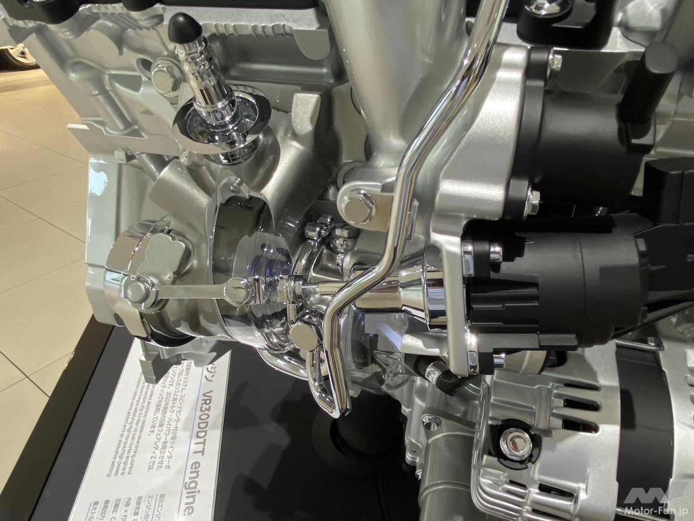 ターボチャージャーは各バンク外側に1基ずつの計2基。シリンダーはVQと同じオープンデッキだが、3.5層のガスケットやヘッドボルトの軸力管理で大きな燃焼圧力に耐える。ターボチャージャーは出力確保のために高回転化。オーバーランを避けるために渦電流式の回転センサーで回転数を監視。水冷式インタークーラーと電動ウェイストゲートで効率アップを図っている。