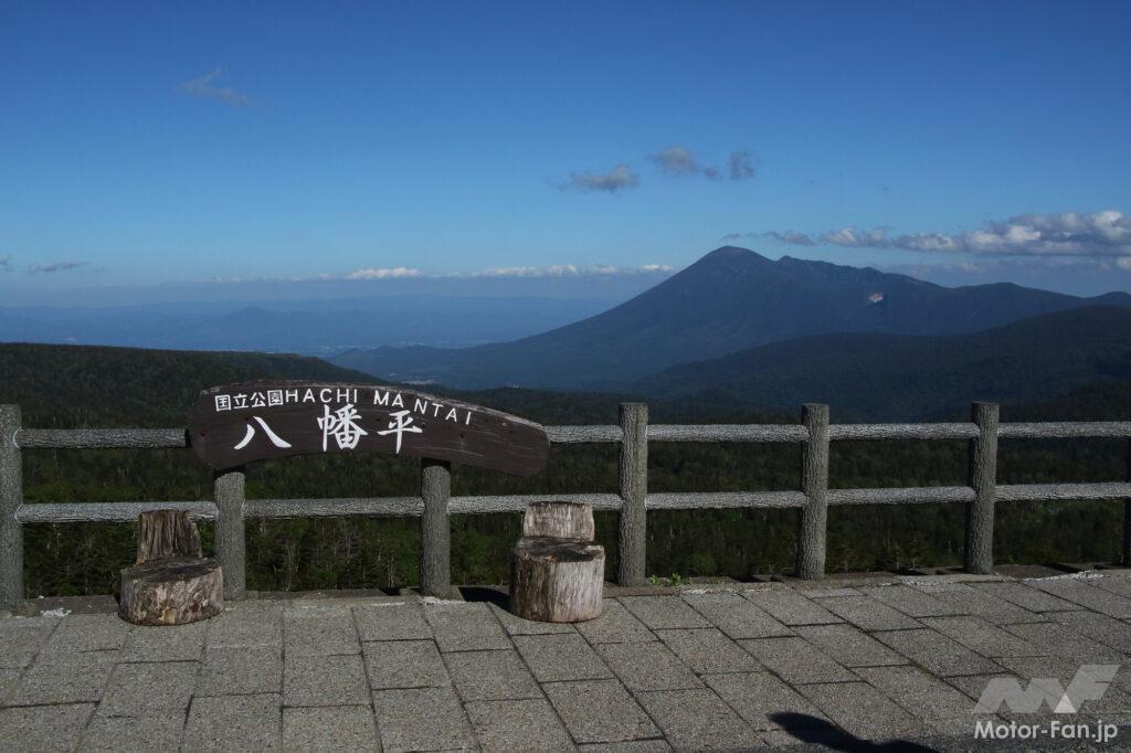 見返峠にある八幡平山頂レストハウス駐車場から国立公園八幡平を望む。ツーリング途中の一服にはピッタリのスポット。八幡平アスピーテライン冬季閉鎖期間(11月上旬〜4月中旬)中は休業しているが、春・夏・秋シーズンは通常午前9時〜午後5時まで営業している。